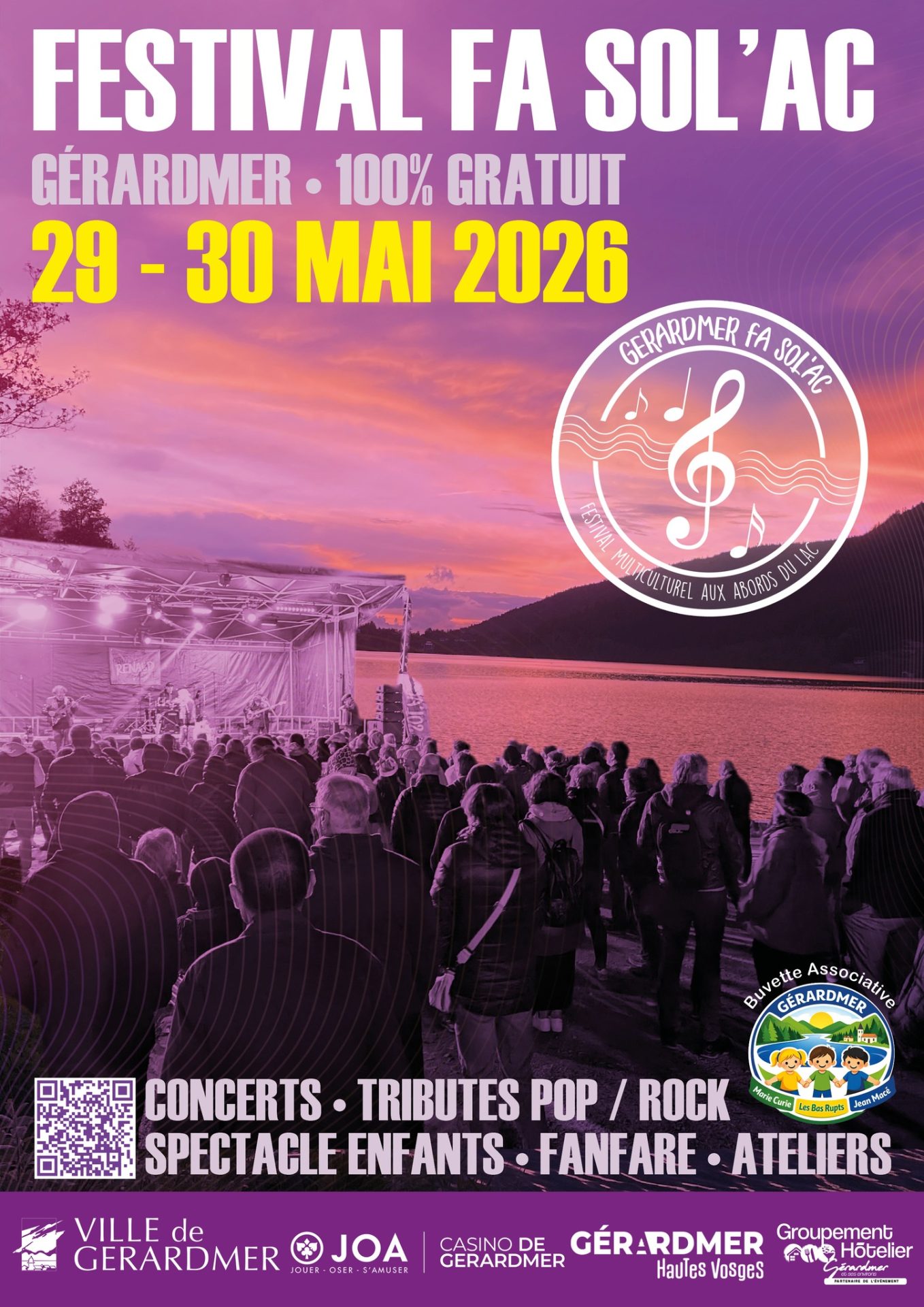 Le festival 100% gratuit FA SOL’AC revient pour une 3e édition les vendredi 29 et samedi 30 mai 2026 au bord du lac de Gérardmer ! Ce rendez-vous culturel incontournable proposera cette année encore une programmation multiculturelle riche et variée mêlant concerts, animations et spectacles. Organisé par la Ville en partenariat avec le Casino JOA de Gérardmer, FA SOL’AC célèbre la diversité artistique à travers la musique, le spectacle vivant et les animations participatives.
