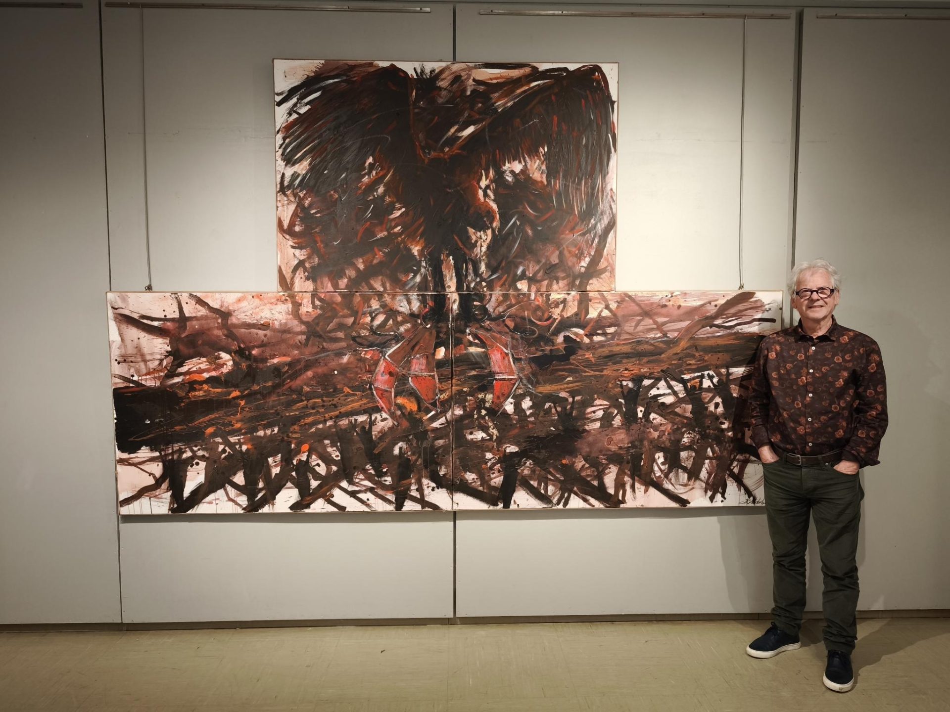 Le fond de chacun de ses tableaux est composé de collages et de peinture qui sont ensuite déchirés et raccommodés » avec du tissu. une sorte de métaphore de la vie, des blessures que l’on subit et que l’on guérit/répare… Toute une histoire ! Quant à Gérard Petitdidier, artiste plus chevronné, il a participé à de nombreuses expositions régionales et internationales. Il est loin d’être un inconnu en terre gérômoise et continue de développer son art autour de thèmes en lien avec les problèmes environnementaux et géopolitiques. Ses œuvres prennent différentes formes, différentes orientations, lui qui aime « changer de geste » et qui fuit la redondance pour mieux se renouveler. jusqu’au 24 avril, vous découvrirez ainsi à la galerie de la maison des toiles extraites de sa série « Pillage » ainsi que de sa série « Chaos » dont le nom ne laisse guère place au doute…