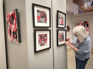 Les habitués des expositions d’Entrelacs connaissent sans doute Nicole, particulièrement investie dans ce collectif d’artistes locaux qui découvre donc un nouveau lieu à investir de ses œuvres. « C’est Jeanny Valence, qui fait également partie d’Entrelacs et du comité de la MCL, qui a proposé des nouveaux noms d’artistes à la commission des expositions dont s’occupe Natacha (Mendez – NDLR). J’aime le rouge et ce concept de fil rouge, de fil conducteur, et j’ai fait le lien avec Gérard dont la dernière exposition comportait beaucoup de noir, couleur qui évoque plutôt la mort. Pour ma part j’ai continué sur l’idée de fil rouge qui évoque pour moi plutôt la vie, la réparation aussi, à travers la notion de fil », explique Nicole.