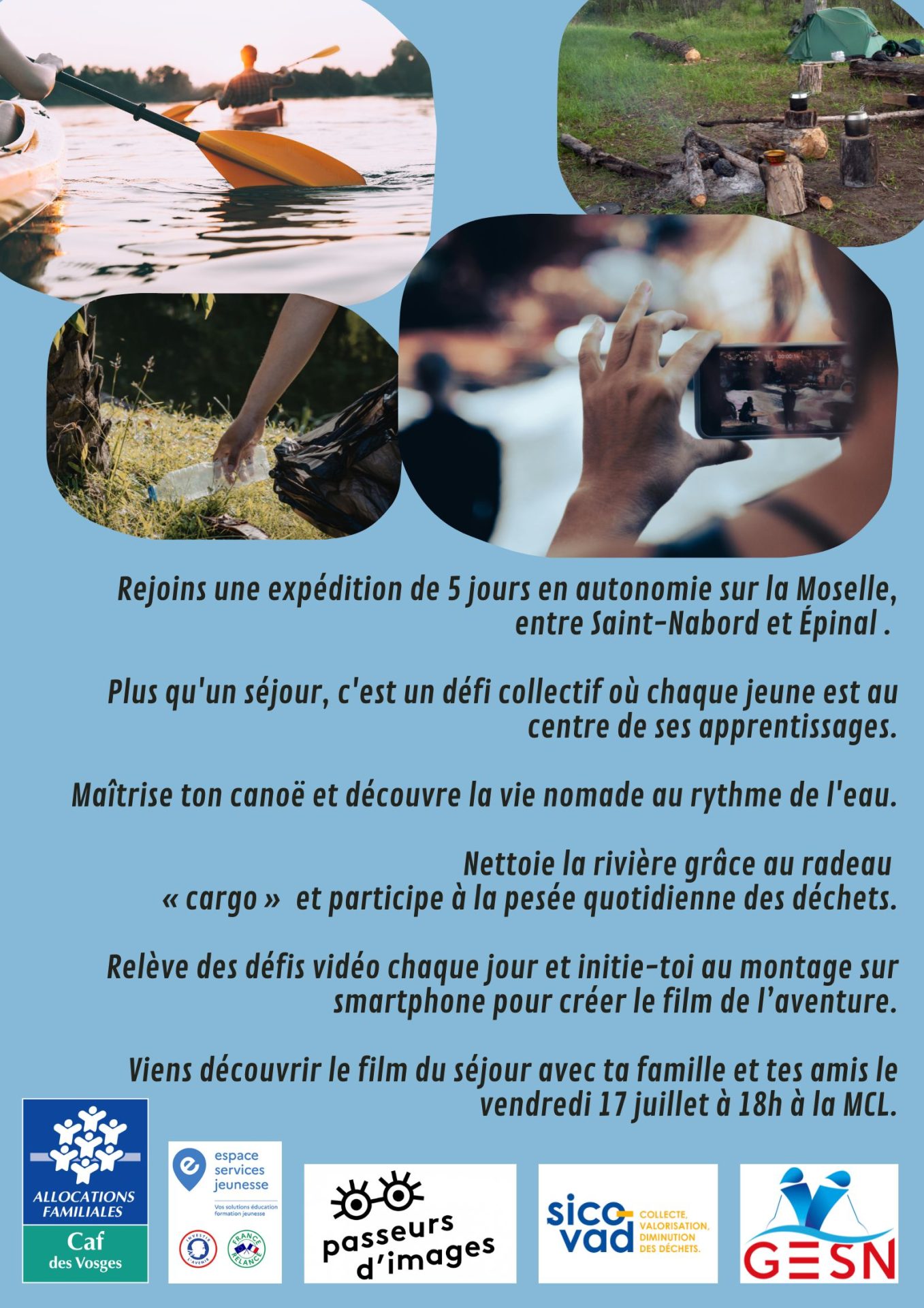 Tu as entre 10 et 14 ans? Tu as soif d’aventure, de grand air et de défis? La MCL lance son expédition pour l’été : 5 jours en itinérance totale sur l’eau, entre Saint-Nabord et Épinal.On ne fait pas que ramer. On embarque sur le radeau « cargo » pour nettoyer la rivière. Chaque soir, c’est le verdict de la pesée : quel impact ton équipe aura-t-elle sur la nature?