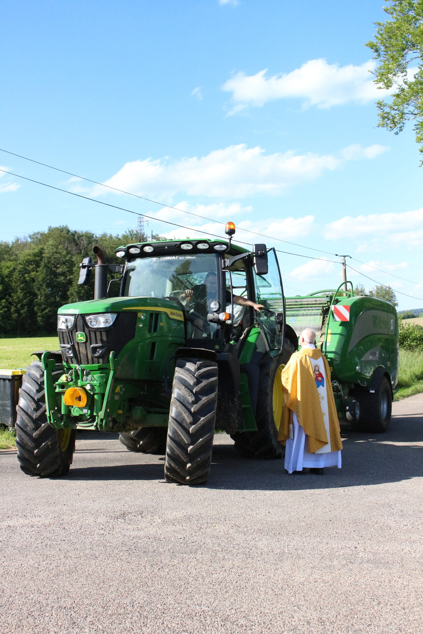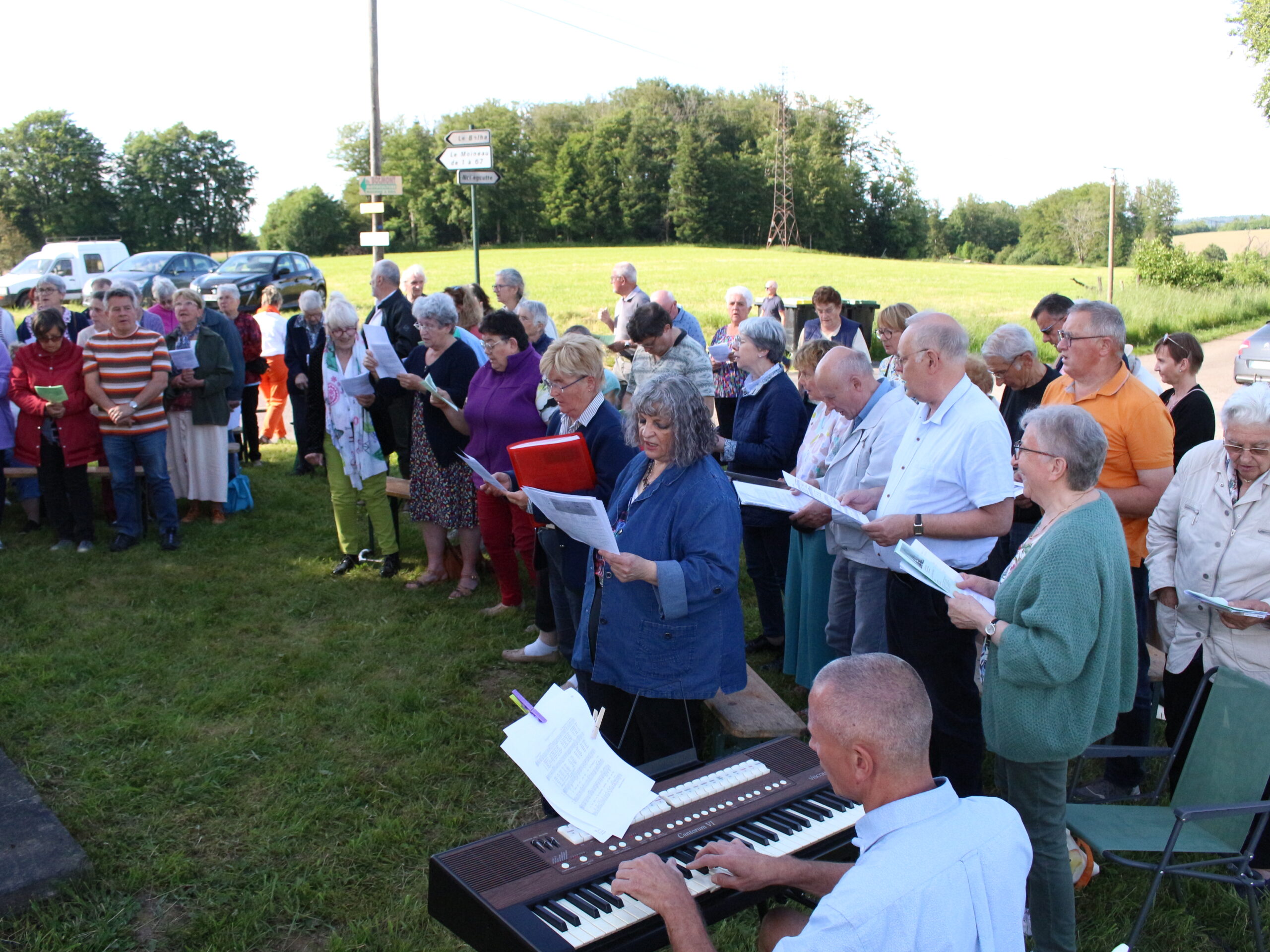 Une jolie petite chapelle en pleine nature, un tracteur qui passe, une musique qui monte dans un ciel bleu parsemé de quelques nuages et une petite foule priante ; voilà pour le décor, ce vendredi en fin de journée.