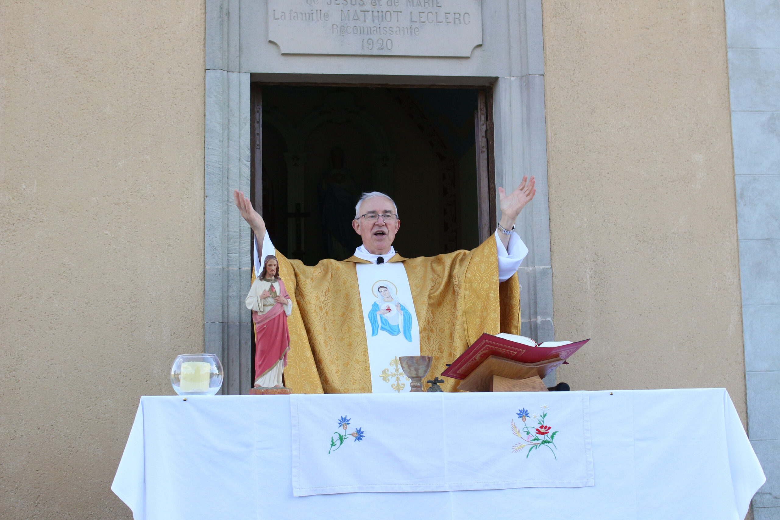 Nous sommes à la chapelle du Moineau (ou chapelle Mathiot), sur la commune du Val d’Ajol, mais sur la paroisse de Plombières. Dans cette chapelle dédiée aux Cœurs immaculés de Jésus et de Marie a eu lieu la messe annuelle, ce vendredi 7 juin, jour de la fête solennelle du Cœur Sacré de Jésus. Environ 80 personnes, des paroisses de Notre Dame des Sources (Plombières), Notre Dame de Combeauté (Val d’Ajol) et Saint Mont (Remiremont) sont venues prier et assister à la messe présidée par l’abbé Claude Durupt, curé des trois paroisses. Hasard du calendrier… Ce jour-là était aussi le jour anniversaire de l’ordination du Père Durupt (43 ans de ministère).
