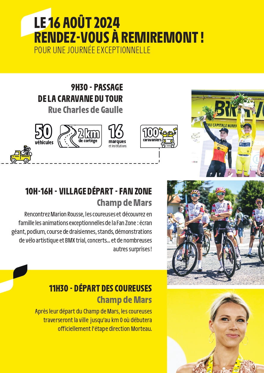 Remiremont aura le grand honneur d’être « Ville départ » de la 6ème étape du Tour de France Femmes avec Zwift 2024. Une véritable fierté pour la ville et surtout l’occasion pour le grand public de profiter des nombreuses animations mises en place lors de ce rendez-vous exceptionnel !