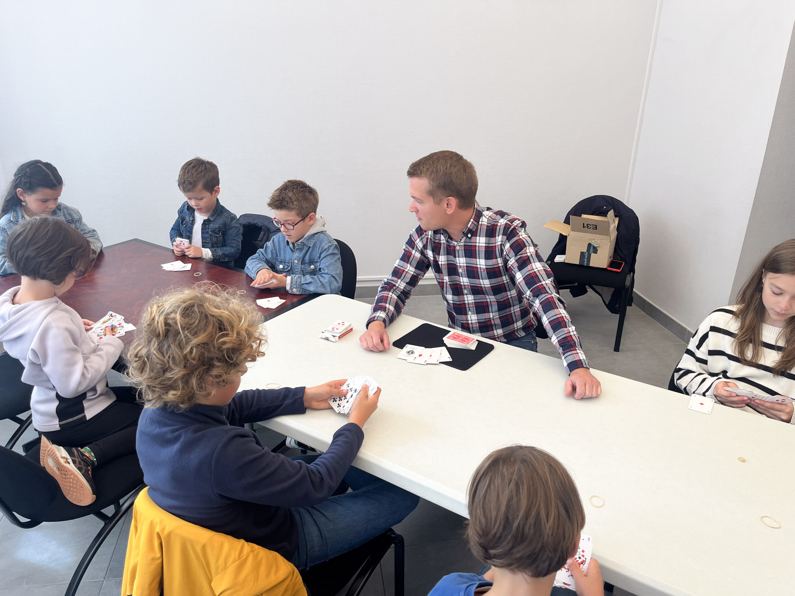 Pendant une durée de 30 minutes, les ateliers magiques ont bluffé et séduit les enfants inscrits au préalable. Par groupes de 10 et après avoir pu jouer à des jeux de société pour patienter, animés par Vivre en Jeux qui a fait preuve d’une généreuse aide auprès des organisateurs de l’opération, les enfants ont pu voir et apprendre tour à tour comment réaliser des prestidigitations avec un paquet de cartes, mais également avec de simples feuilles magiques créant des illusions d’optique. À la condition que les enfants ne dévoilent jamais la technique utilisée, Clément Demangel leur a donné son secret pour qu’ils puissent eux aussi duper leur entourage ! Chaque enfant est ressorti avec le sourire de son initiation à la magie et ne manquera certainement pas de revenir demain pour le spectacle mis en scène par le magicien professionnel.
