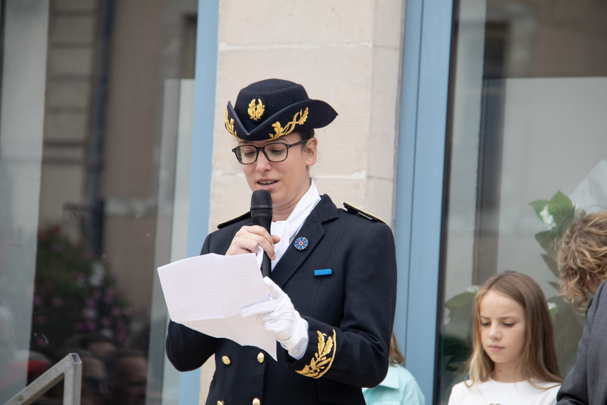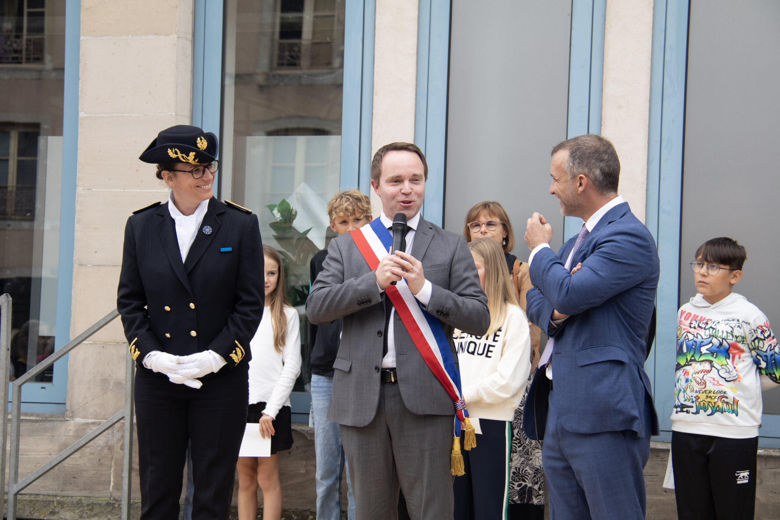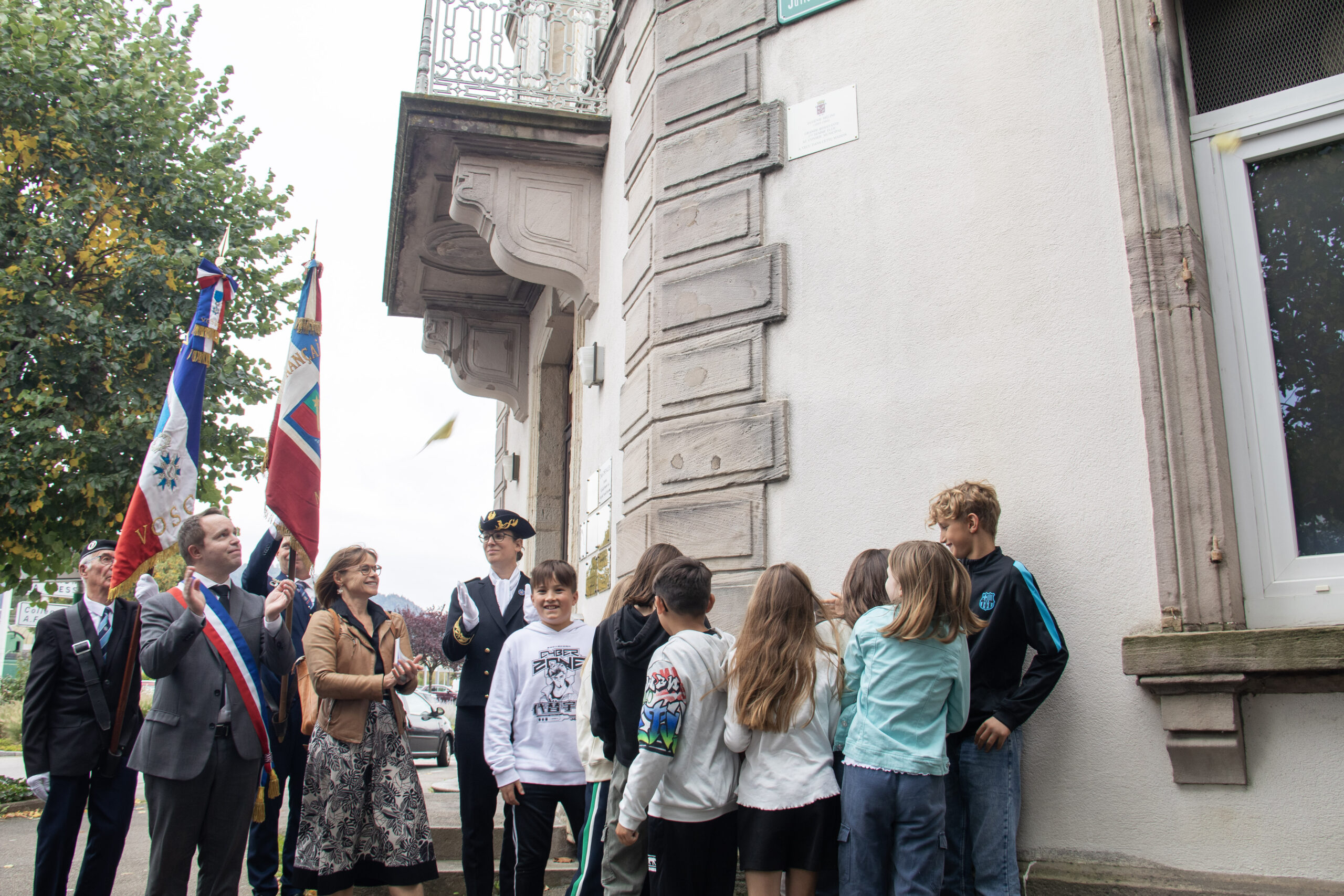 Le rendez-vous était donné devant la statue du Volontaire, là où 80 ans auparavant, René Menigoz avait filmé les Allemands fuyant la ville. C’est ainsi qu’à cet emplacement, Jean-Benoît Tisserand a rappelé les faits historiques et célébré cet anniversaire de la Libération. Christophe Naegelen et Anne Carli ont ensuite prononcé eux aussi un discours. Tous les trois ont abordé et rendu hommage à Eugénie Méline, résistante de cette guerre, et ont tenu à féliciter chaleureusement les enfants de l’école de la Maix qui ont préparé un exposé sur cette figure emblématique romarimontaine. Pour poursuivre cet hommage à Eugénie Méline, le défilé s’est rendu à l’avenue Julien Méline pour dévoiler et inaugurer une plaque commémorative en l’honneur d’Eugénie, sa femme.