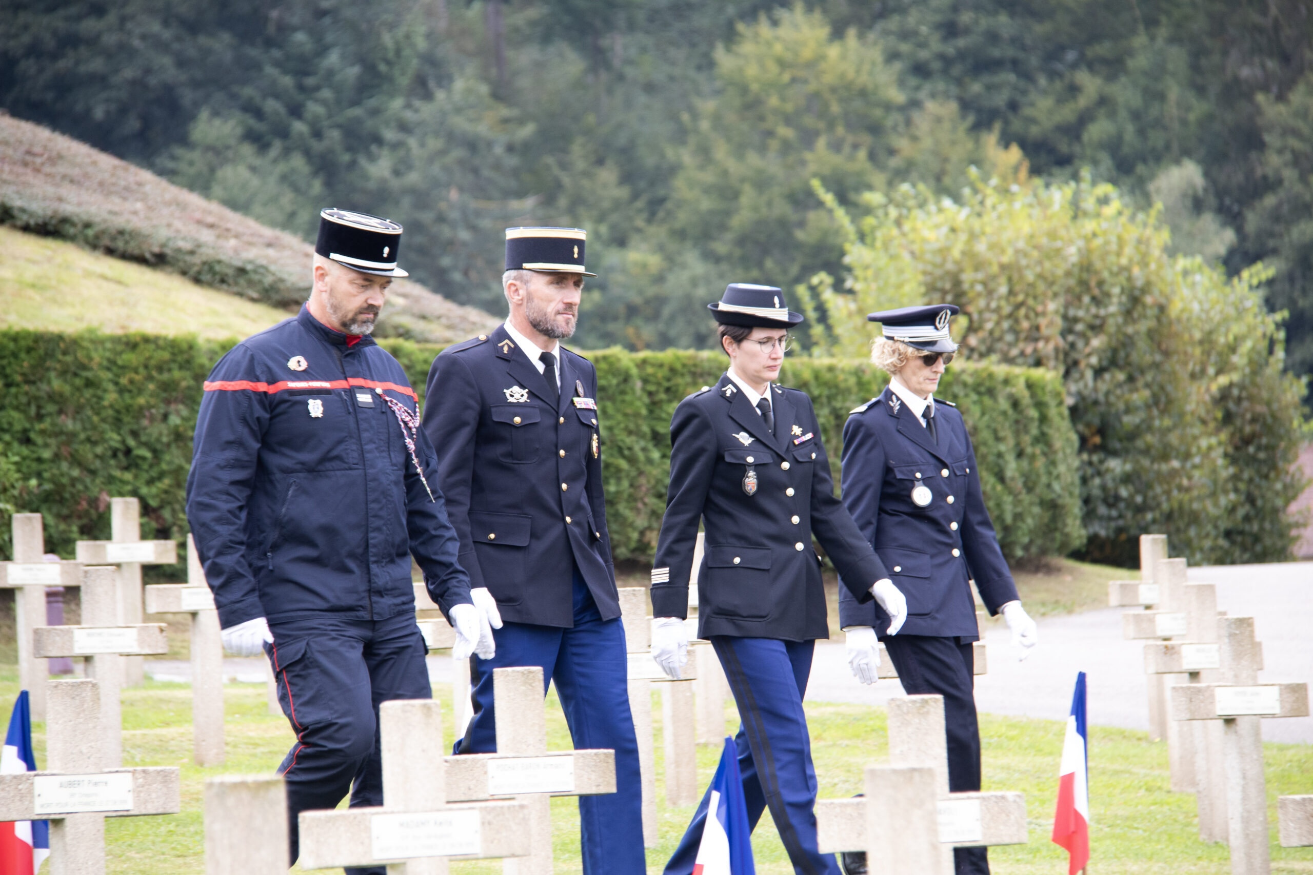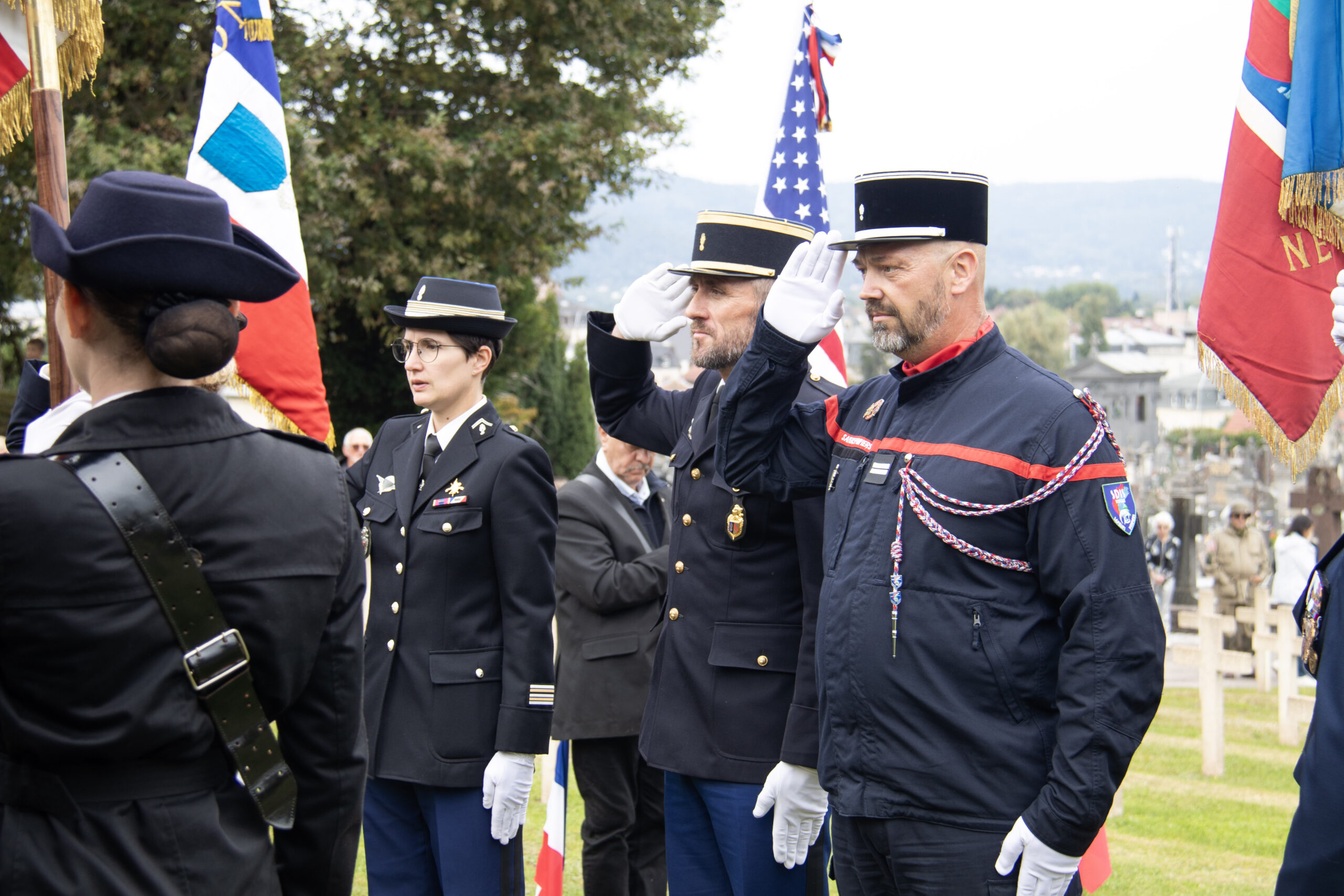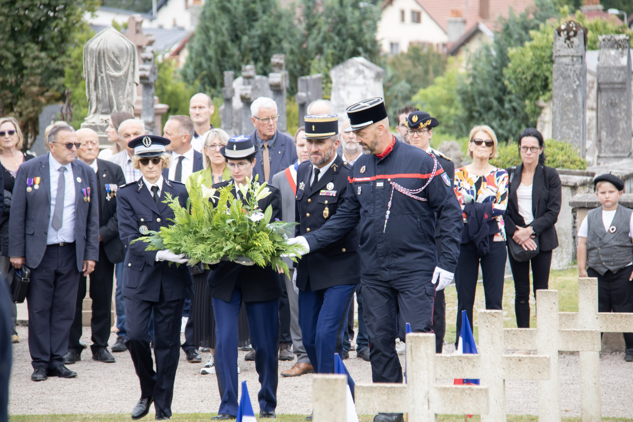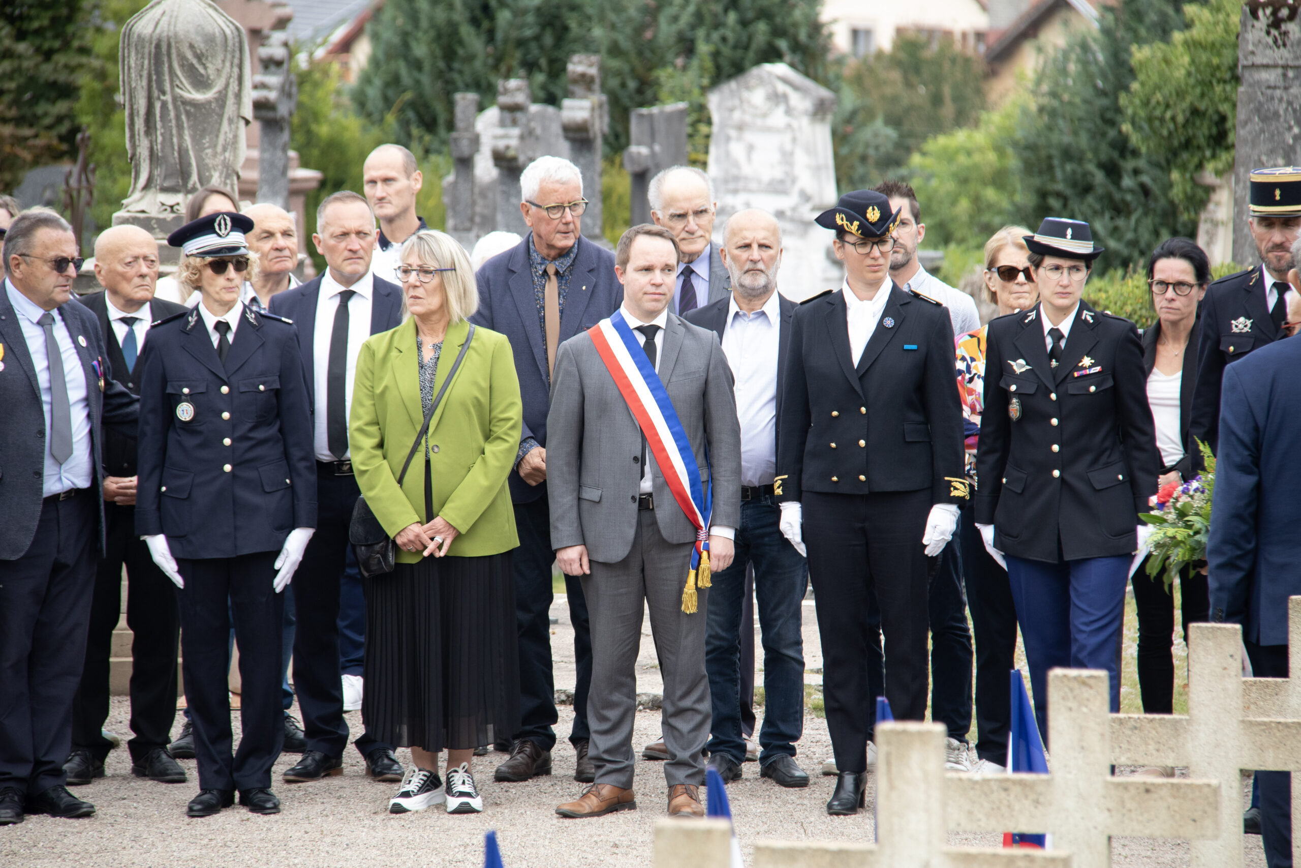 La cérémonie s’est ensuite poursuivie au Cimetière de la ville. Dans un premier temps, au pied du monument aux morts pour procéder au dépôt de gerbes, à la levée des couleurs et à une minute de recueillement. Puis, dans un second temps, tous se sont rendus au Cimetière militaire.
