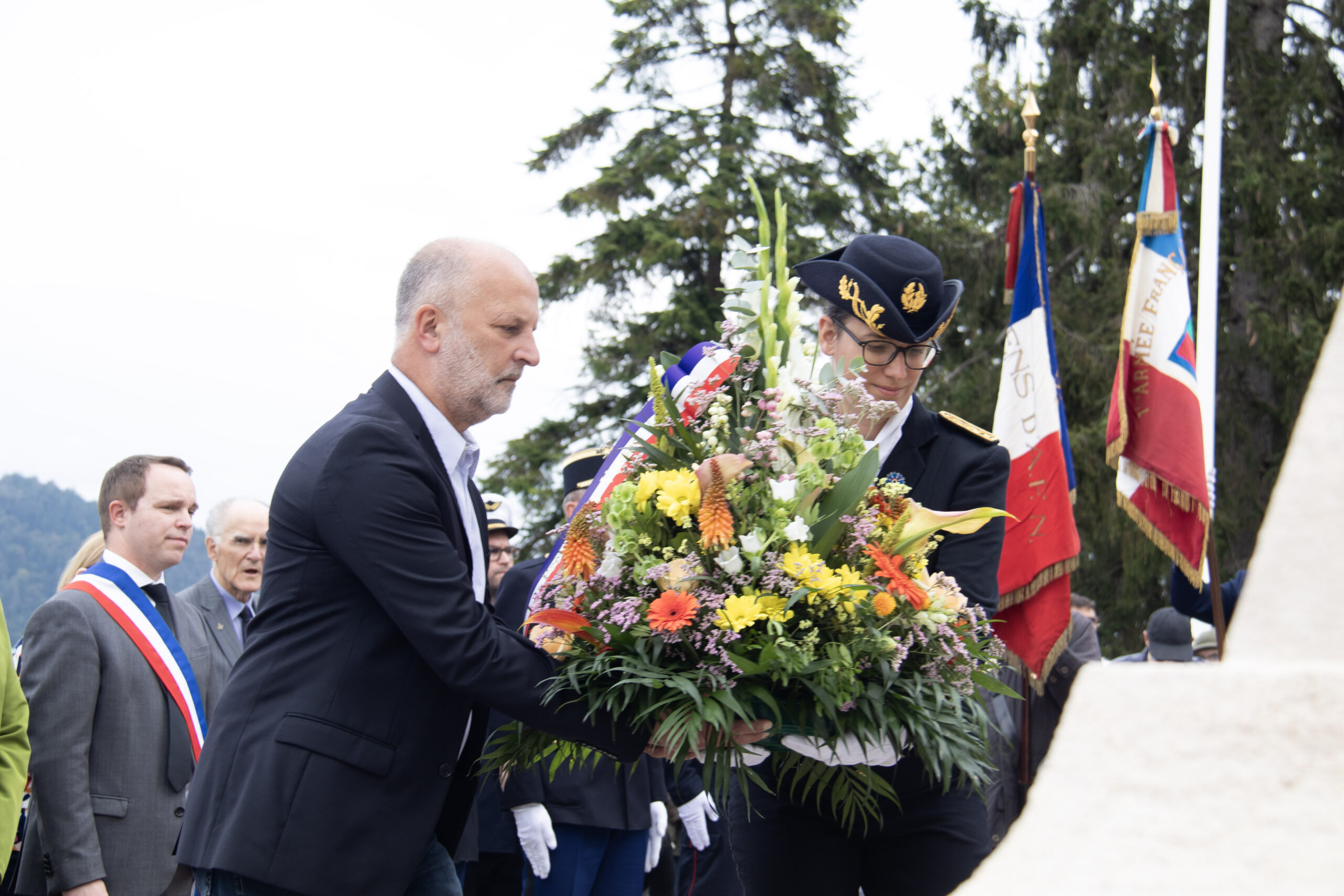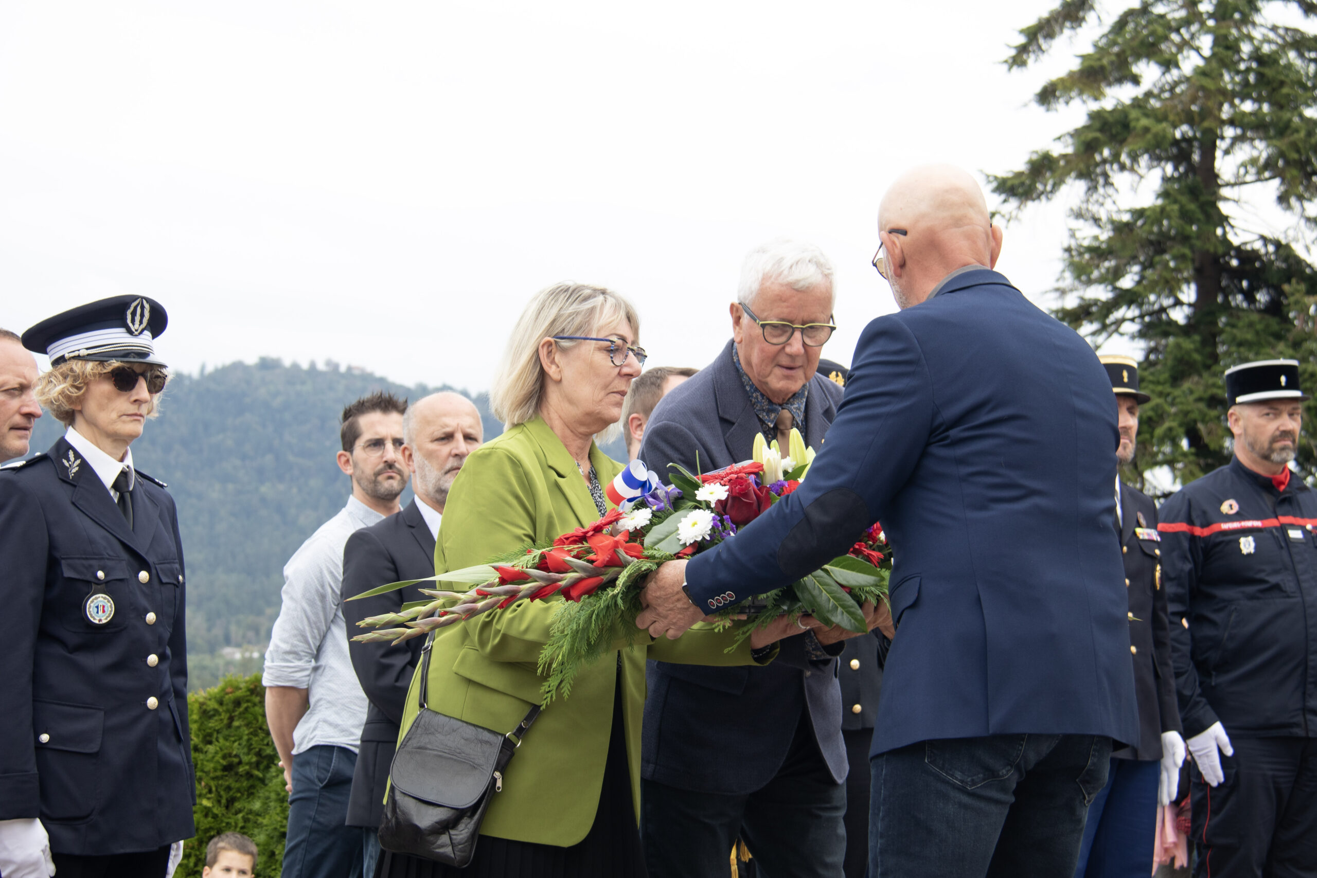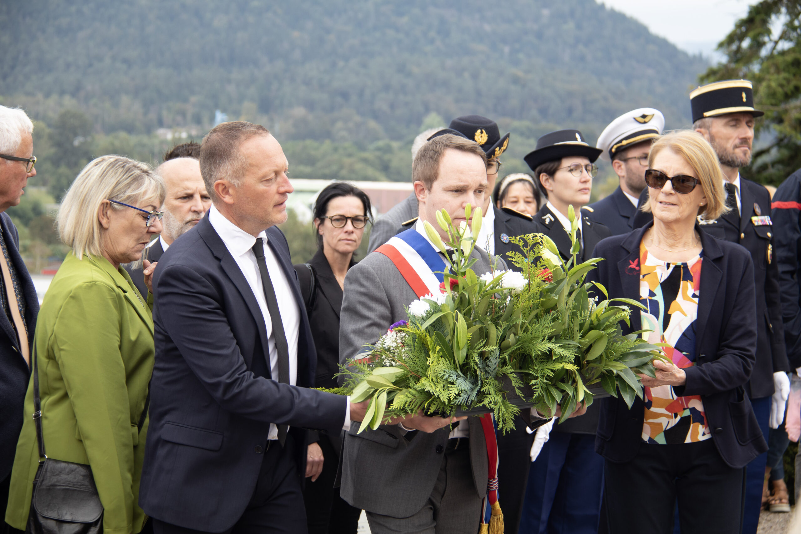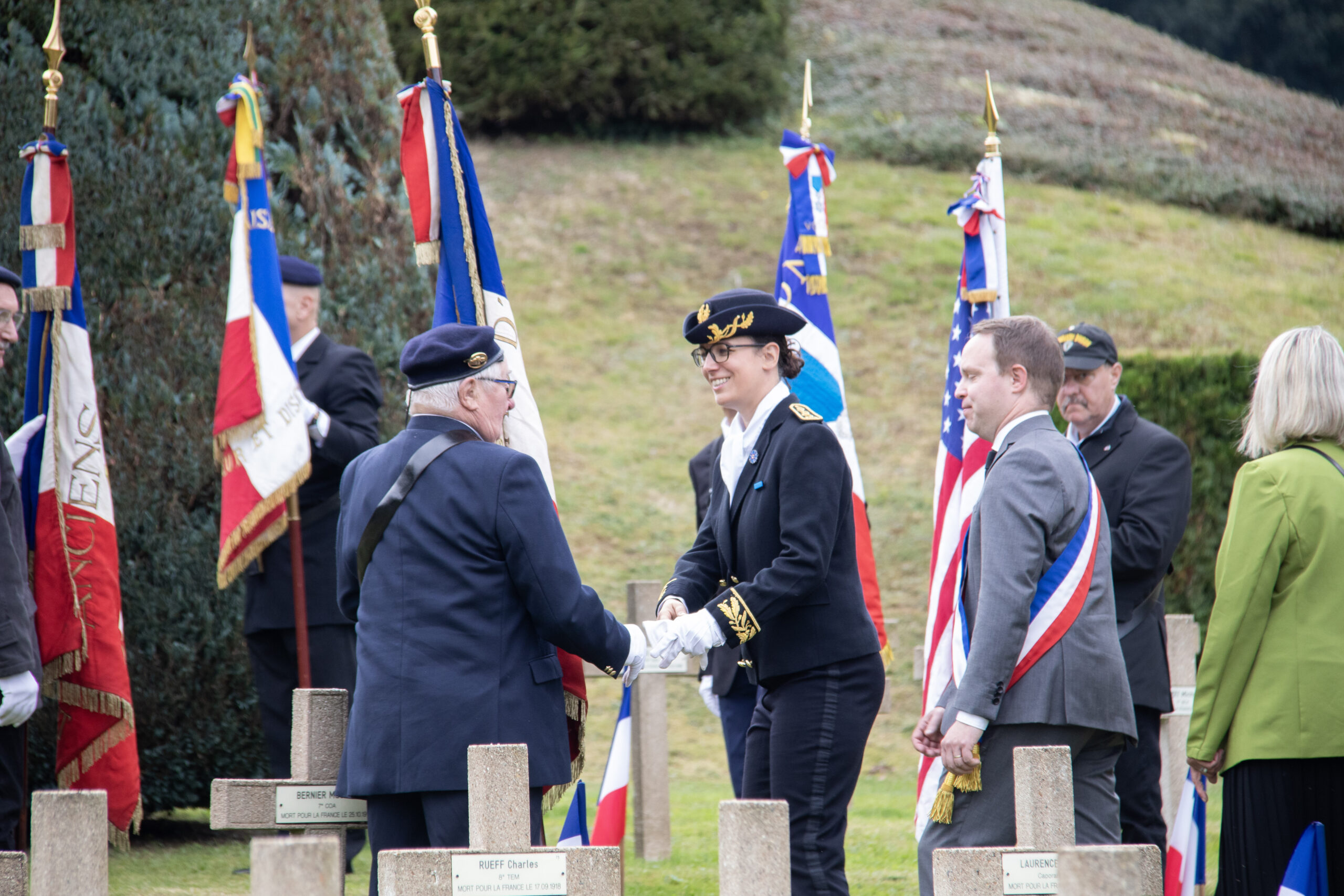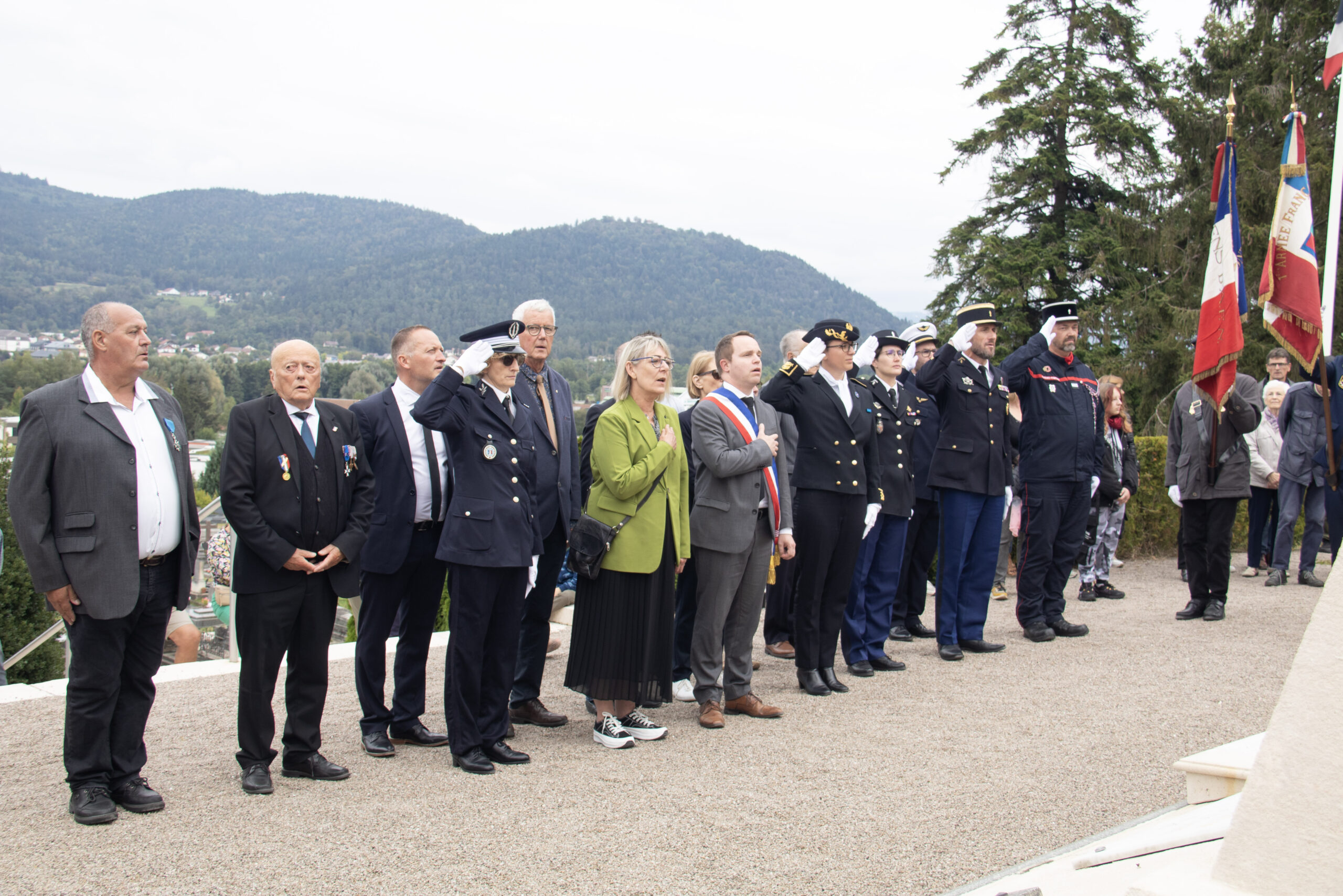 La cérémonie s’est ensuite poursuivie au Cimetière de la ville. Dans un premier temps, au pied du monument aux morts pour procéder au dépôt de gerbes, à la levée des couleurs et à une minute de recueillement. Puis, dans un second temps, tous se sont rendus au Cimetière militaire.