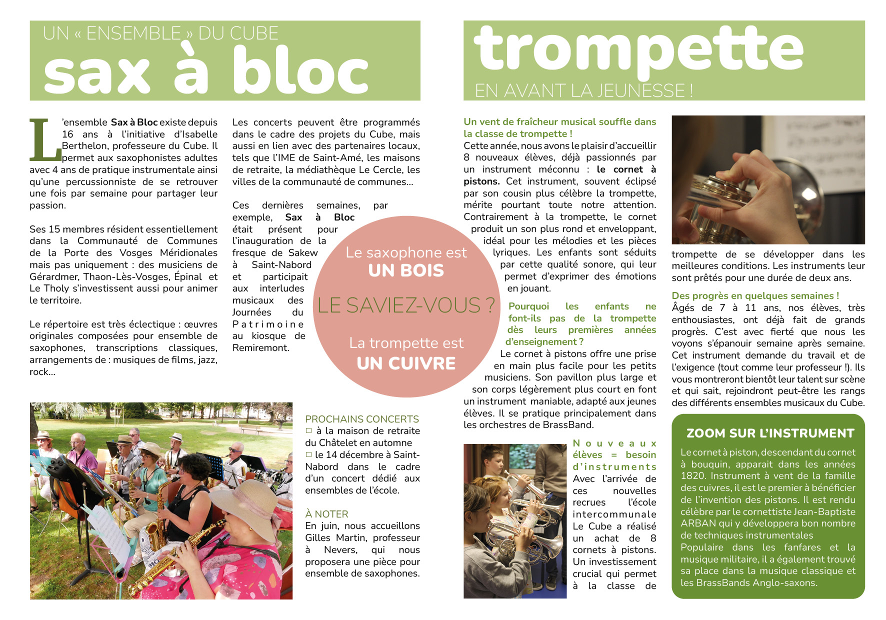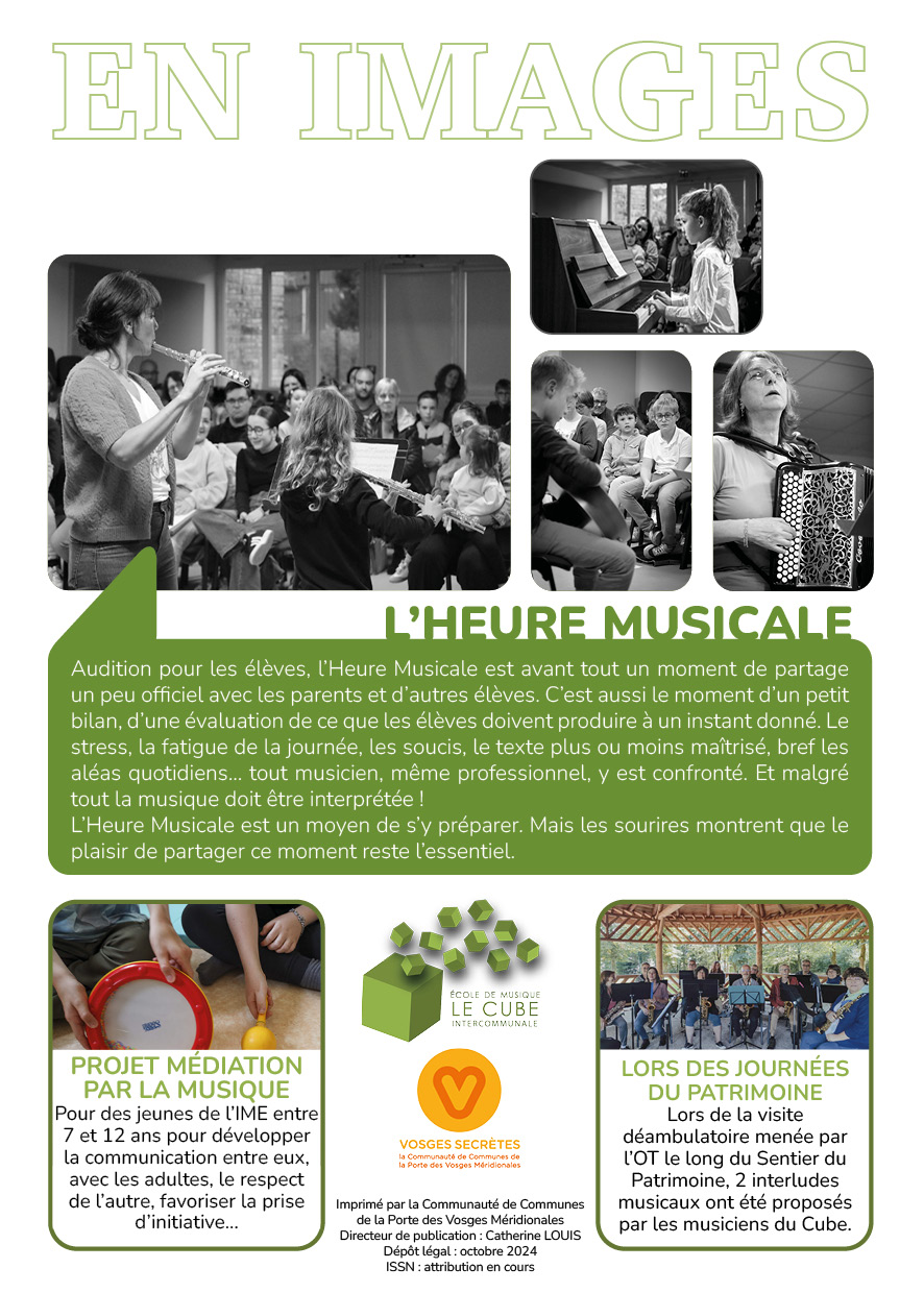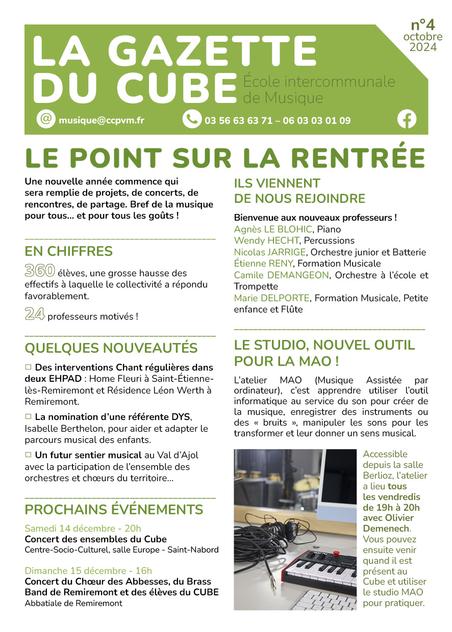 L’école intercommunale Le Cube vient de dévoiler sa gazette n°4 où elle livre ses dernières actualités. La rentrée s’est déroulée sous un bon jour avec des effectifs en hausse avec 360 élèves et 24 professeurs. Des nouveautés vont également voir le jour avec des interventions diverses dans des EHPAD et la création d’un futur sentier musical au Val d’Ajol. Retrouvez la gazette ci-dessous :