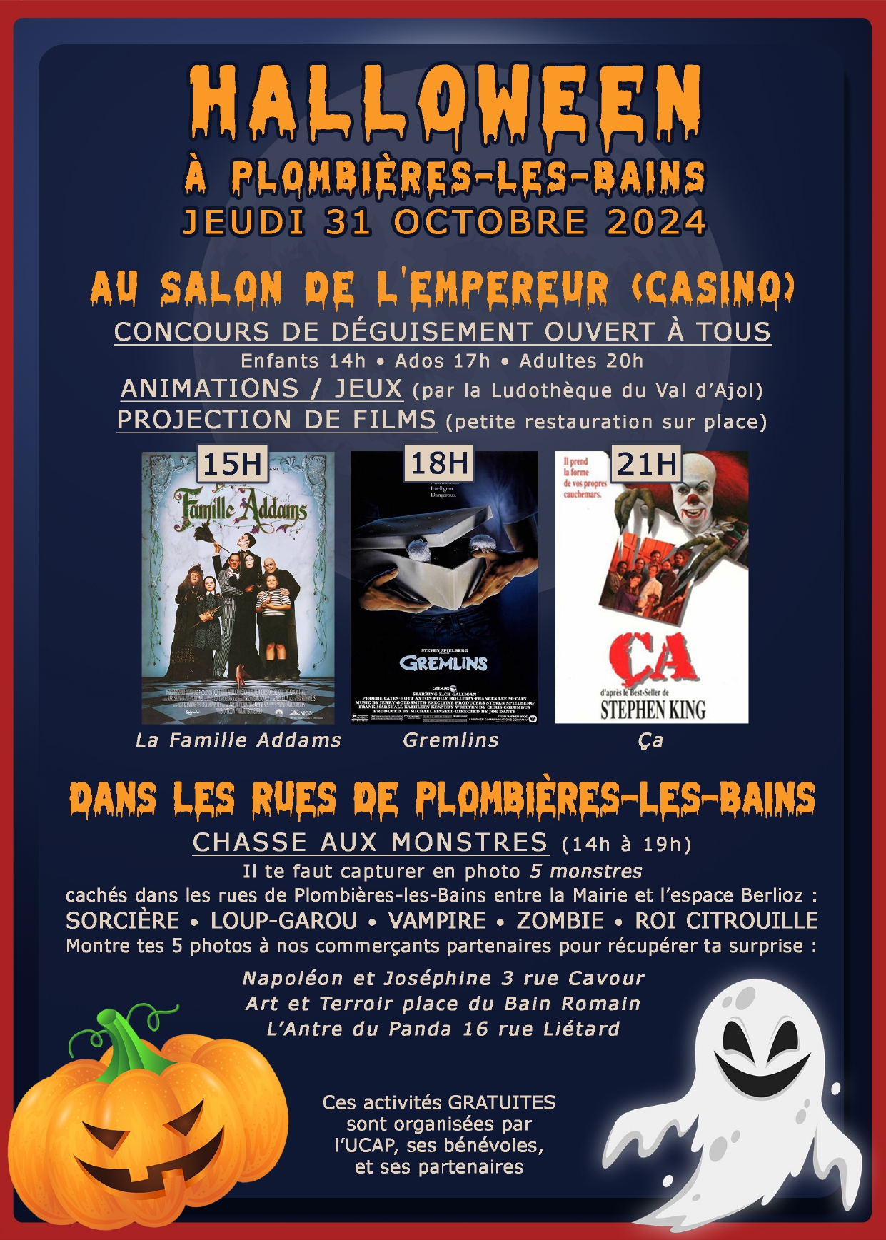 L’UCAP organise une animation Halloween à Plombières-les-Bains le jeudi 31 octobre. Elle aura lieu au casino au Salon de l’empereur et dans les rues de la ville. Vous trouverez ci-dessous les affiches relatives à l’évènement :