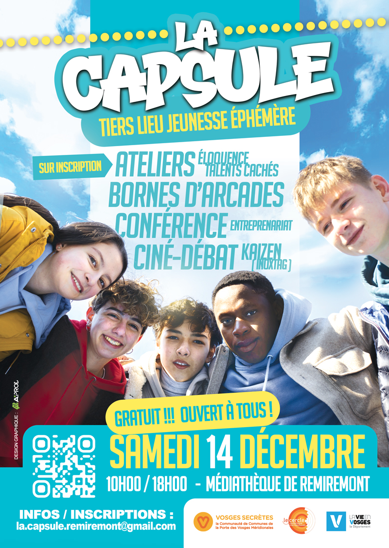 En partenariat avec le Conseil Départemental des Vosges dans le cadre du projet Simplik et la Communauté de Communes de la Porte des Vosges Méridionales, l’équipe de la Capsule (Jad Bengrina, Arthur Naviliat, Héléna Lerat) accueillera le lancement de La Capsule, un tiers- lieu innovant conçu pour les jeunes et par les jeunes le samedi 14 décembre 2024.