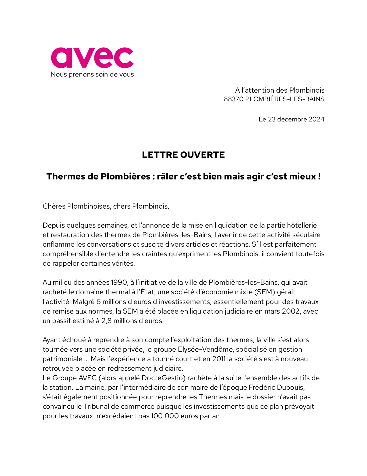 Le président du groupe AVEC insiste sur l’importance d’un dialogue constructif et d’une mobilisation collective pour éviter que la station thermale de Plombières-les-Bains ne connaisse le même sort que celle de Bourbonnes-les-Bains, dont les thermes ont été fermés. « La ville de Plombières-les-Bains continue à refuser tout dialogue avec nous alors que le temps file et qu’il ne reste que peu de temps pour préparer la prochaine saison thermale. », conclut-il.