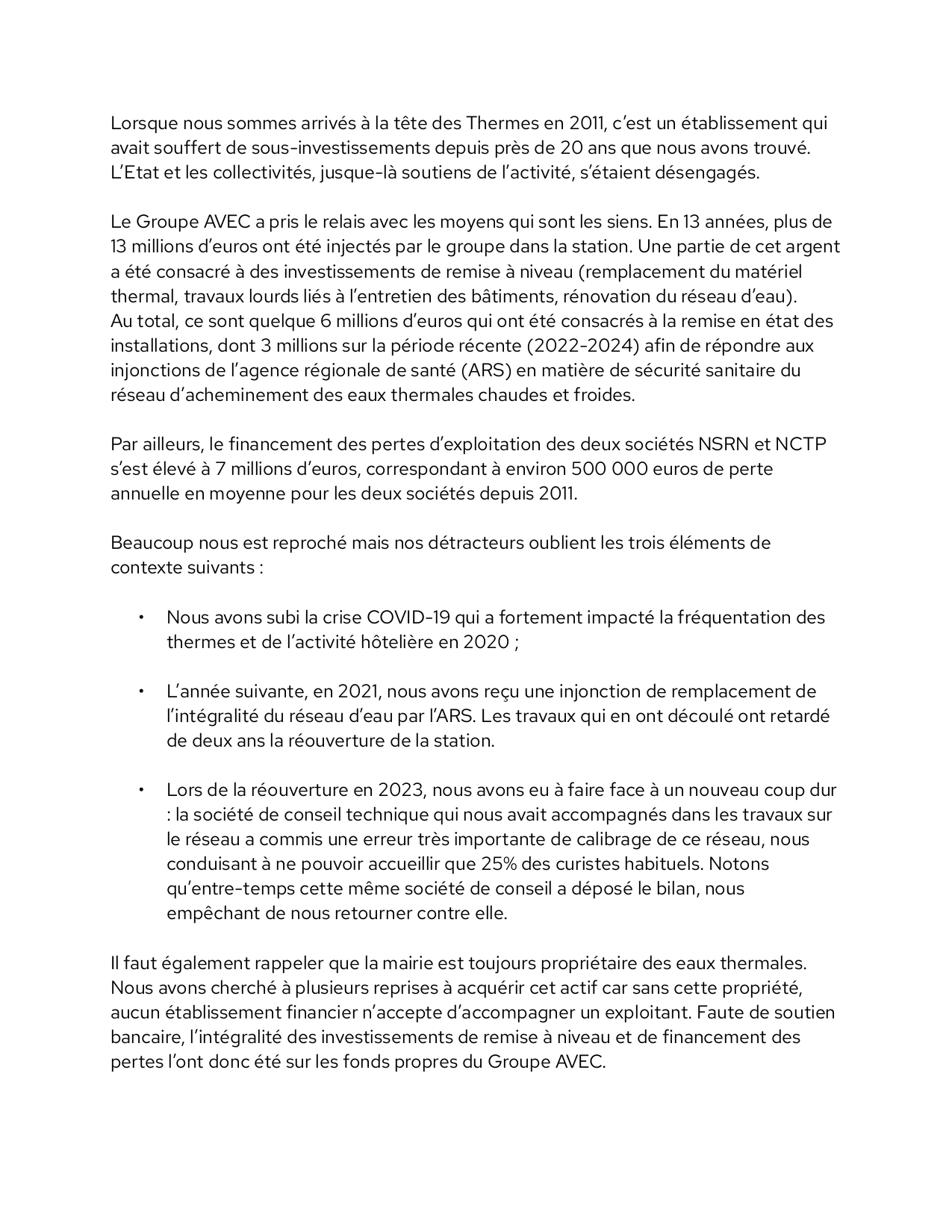 Le groupe AVEC, qui a repris les thermes en 2011, après plusieurs tentatives infructueuses de relance par d’autres acteurs, a investi massivement pour remettre l’établissement à niveau. Parmi ces investissements, 6 millions d’euros ont été dédiés à la rénovation des installations, dont 3 millions entre 2022 et 2024 pour répondre aux exigences sanitaires imposées par l’Agence Régionale de Santé. Malgré ces efforts, la situation reste difficile, et le groupe AVEC ne peut plus assumer seul le financement de la station.