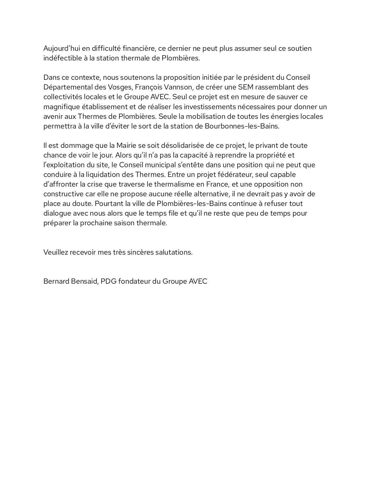 Bensaid plaide pour une solution collective, en soutenant la proposition de création d’une société d’économie mixte (SEM), portée par le président du Conseil Départemental des Vosges, François Vannson. Cette SEM, réunissant des collectivités locales et le groupe AVEC, serait selon lui la seule alternative viable pour sauver les thermes. Il regrette cependant que la mairie de Plombières-les-Bains se soit désolidarisée de ce projet, une position qui, selon lui, pourrait entraîner la fermeture définitive de l’établissement.