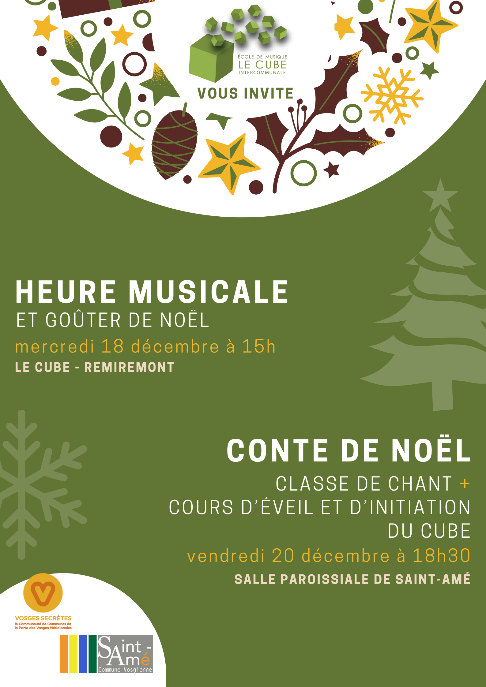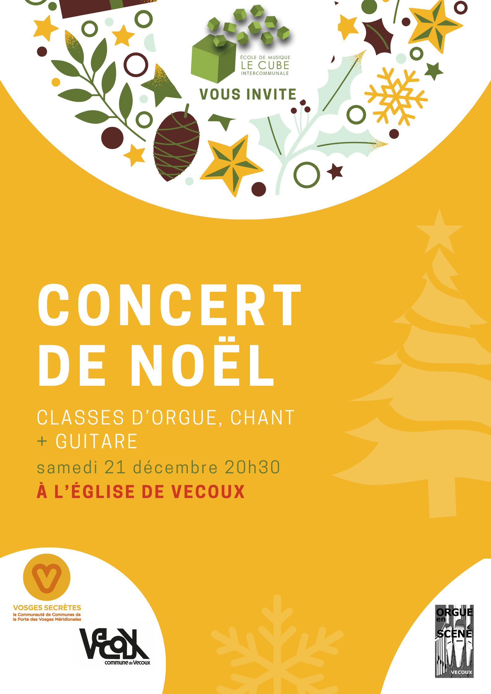 Les classes d’orgue, chant et guitare vous proposent un concert avec l’association Orgue en scène pour des pièces classiques et plus traditionnelles autour de Noël.
