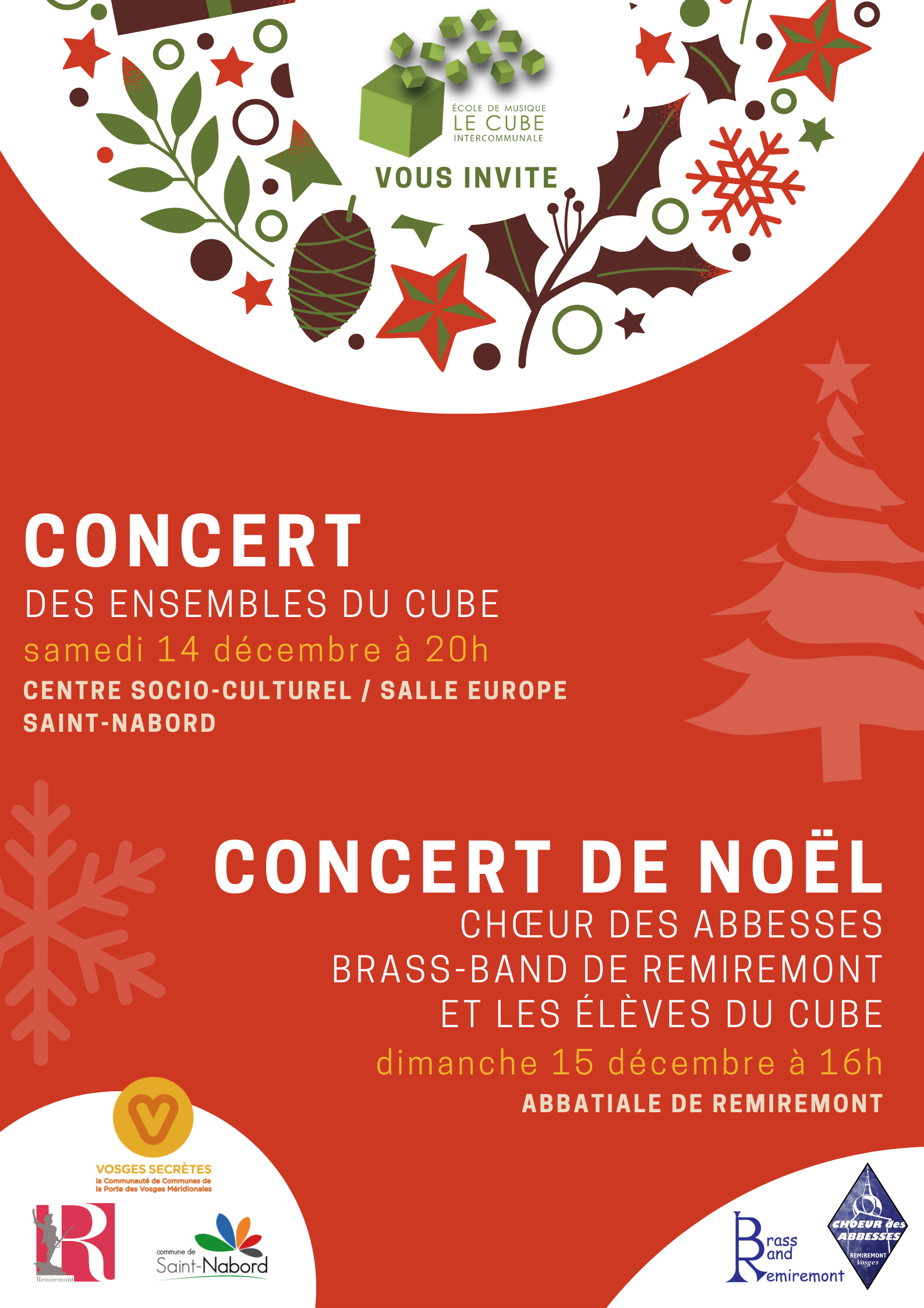 CENTRE SOCIO-CULTUREL DE SAINT-NABORD Le concert des ensembles du Cube, ce sont des dizaines de musiciens qui se regroupent pour vous faire découvrir leur répertoire. L’Orchestre à vents junior pour écouter les plus jeunes, les ensembles de musique amplifiées, l’ensemble de saxophones Sax à Bloc, les élèves de formation musicale au chant, le Brass Band et ses cuivres bien rythmés, l’ensemble de guitare… Il y a en aura pour tous les goûts musicaux !
