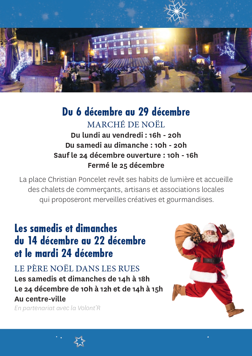 Le coup d’envoi des festivités sera donné ce jeudi 5 décembre avec un concert de musique irlandaise au Centre culturel Gilbert Zaug. Dès le lendemain, le marché de Noël ouvrira ses portes sur la place Christian Poncelet. Inauguré en grande pompe, il accueillera les visiteurs jusqu’au 29 décembre.Des animations pour tous les goûts
