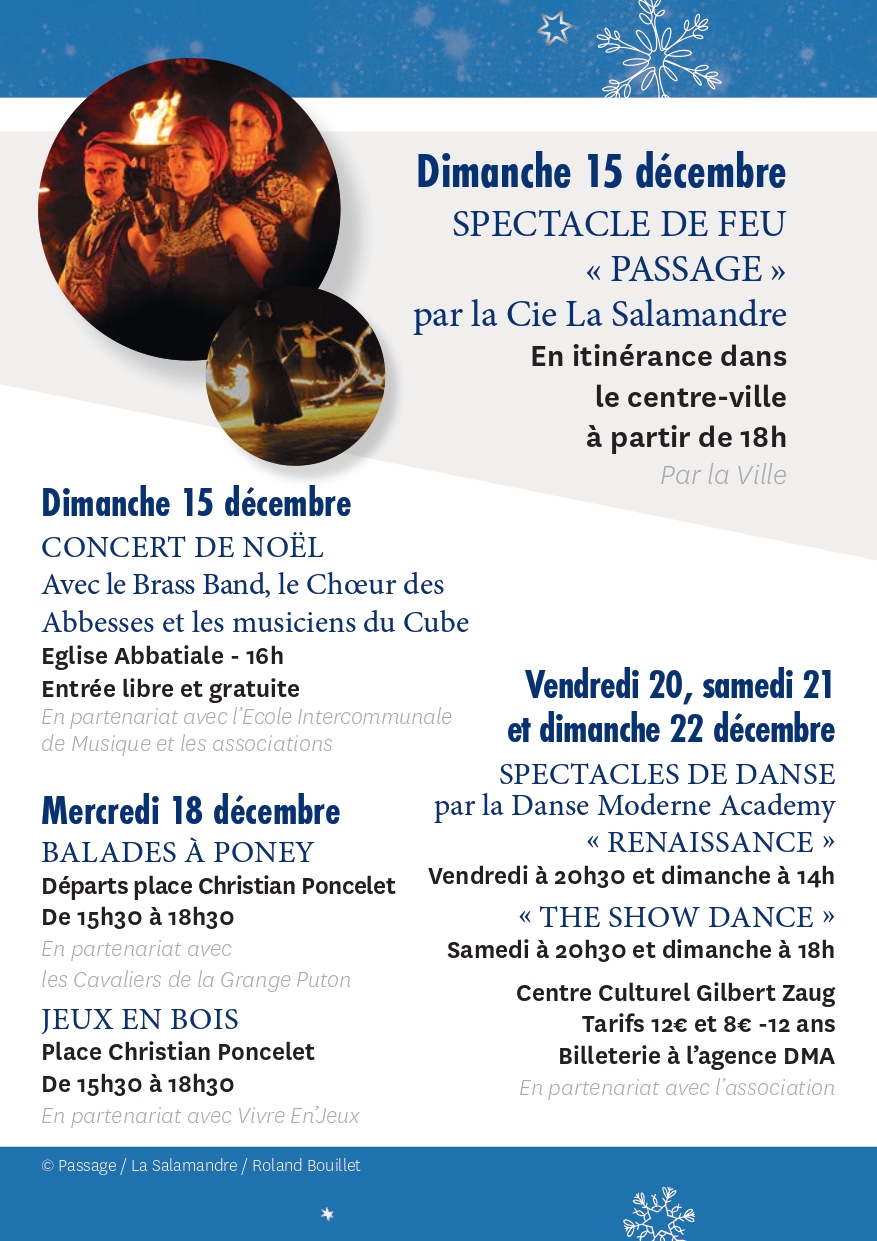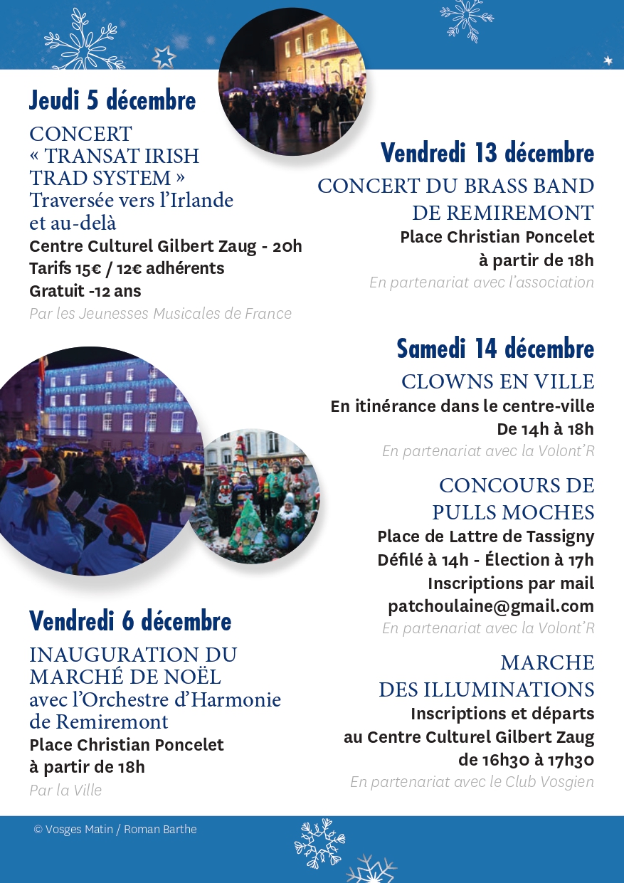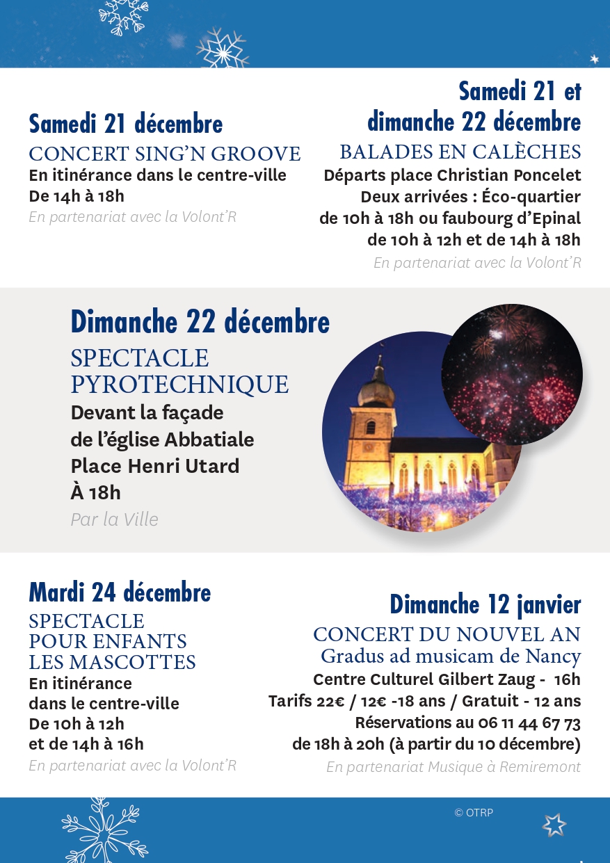 Pour couronner ces festivités, la municipalité proposera un spectacle de feu itinérant qui illuminera les rues de la ville, mais également un grand spectacle pyrotechnique pour émerveiller les foules.Retrouvez le programme complet ci-dessous et laissez-vous emporter par la magie de Noël à Remiremont !