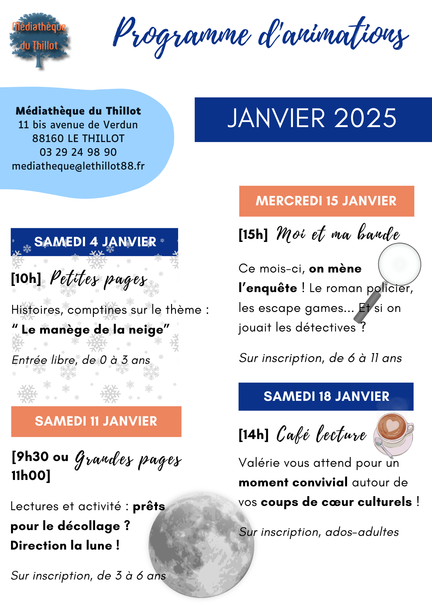 Retrouvez ci-dessous le programme des animations de janvier 2025 à la médiathèque du Thillot :