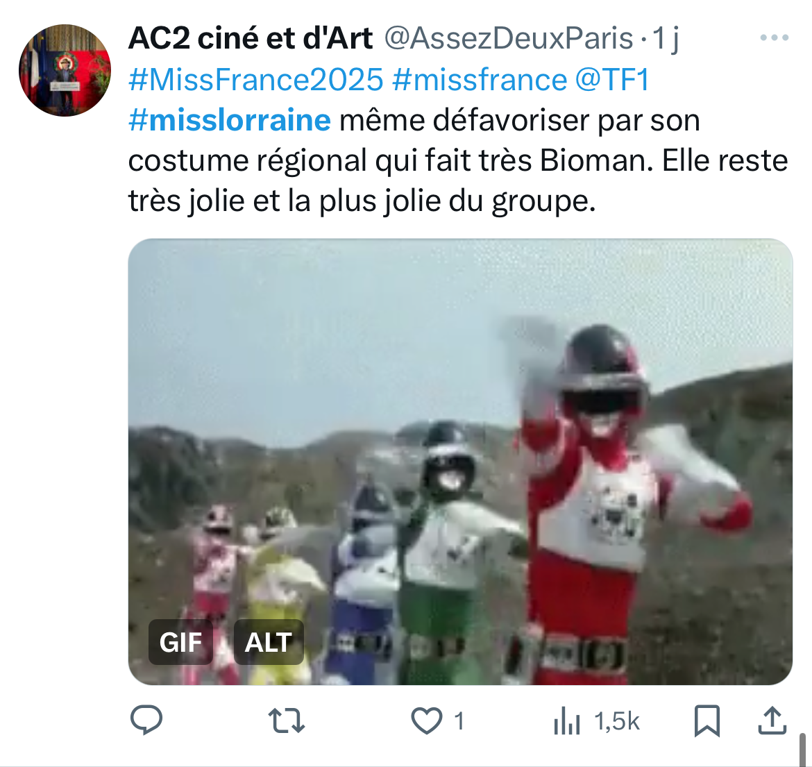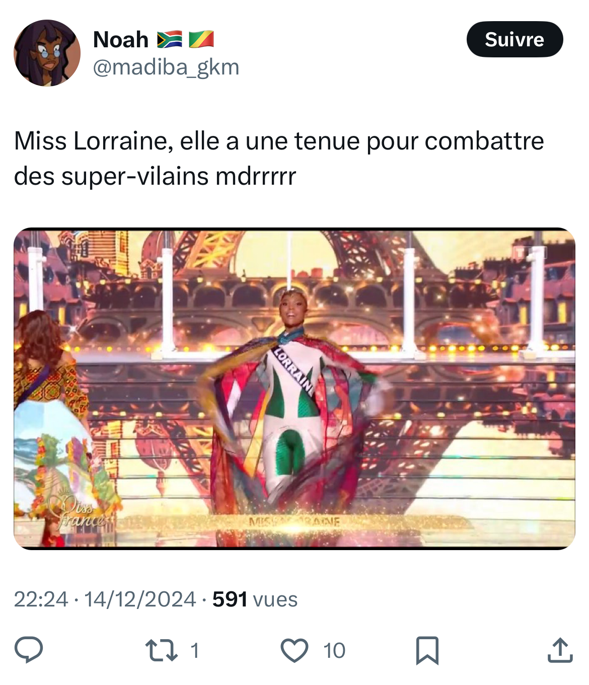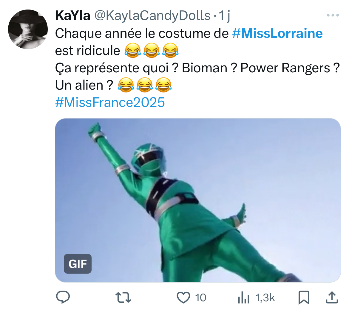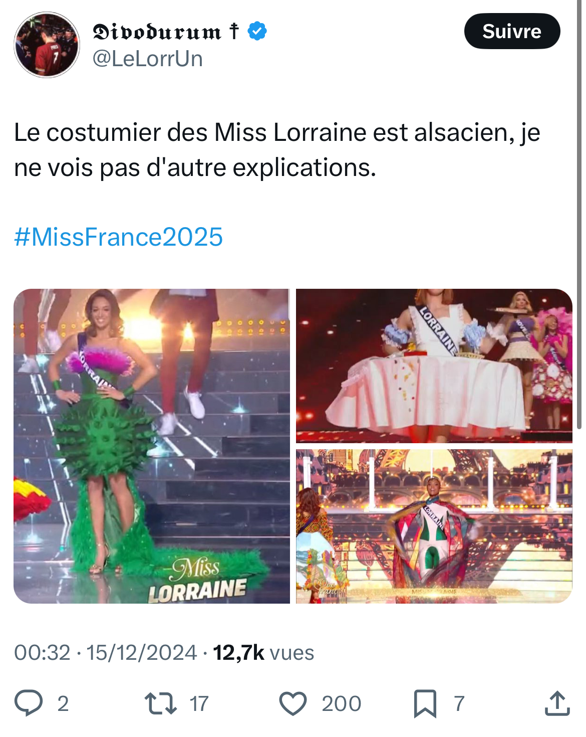 Comme l’an passé – où la Miss Lorraine arborait un costume en forme de table – le costume régional a suscité de vives réactions humoristiques sur les réseaux sociaux et notamment sur X (Twitter). Nous avons fait une sélection pour vous des réactions les plus drôles :