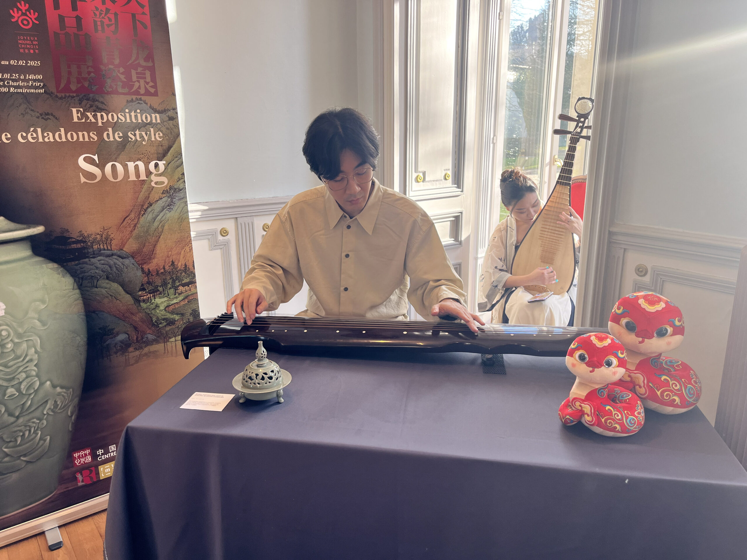 Outre la découverte des œuvres, l’événement offrait une dégustation de thé ainsi qu’une présentation musicale des instruments traditionnels chinois, le guqin et le pipa, invitant les visiteurs à une immersion sensorielle dans la culture chinoise.