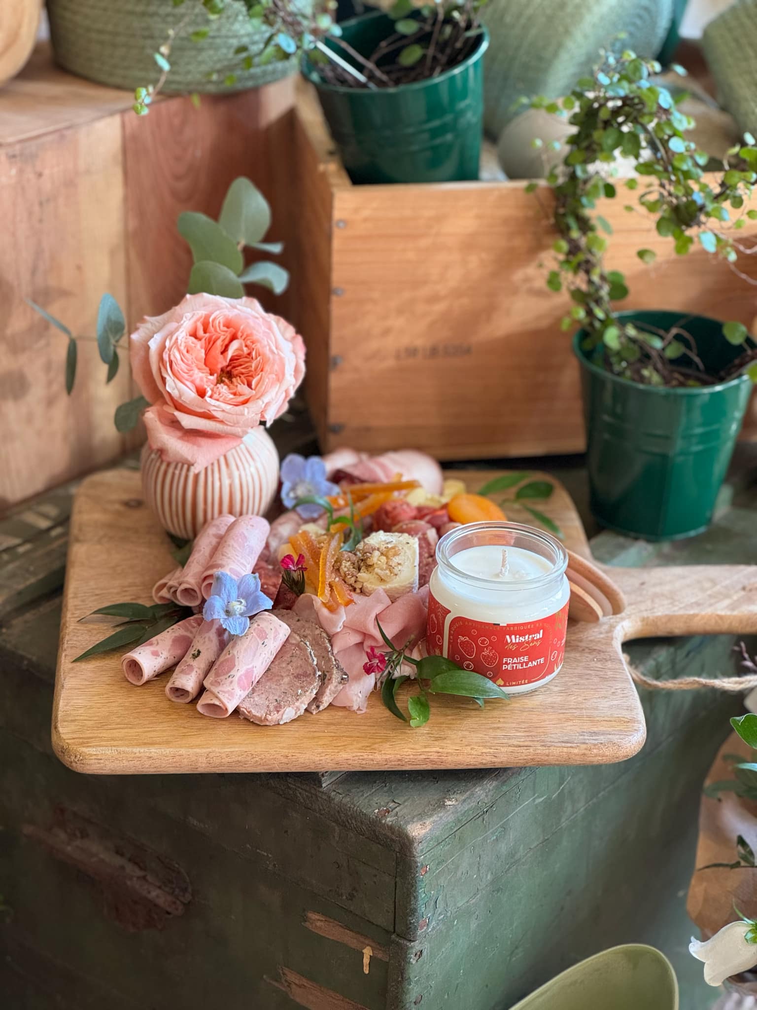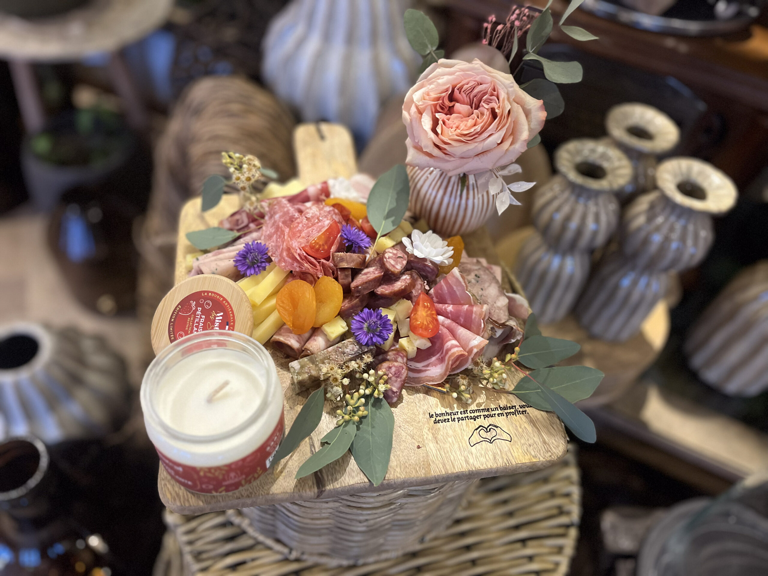Chaque année, nous essayons d’innover en proposant diverses compositions avec des artisans locaux : cette année, nous proposons des planches en partenariat avec la Boucherie Remy. Elles sont composées d’une planche à découper en bois avec une gravure personnalisée faite dans notre boutique, d’une fleur séchée, d’une bougie et, bien entendu, de la charcuterie.