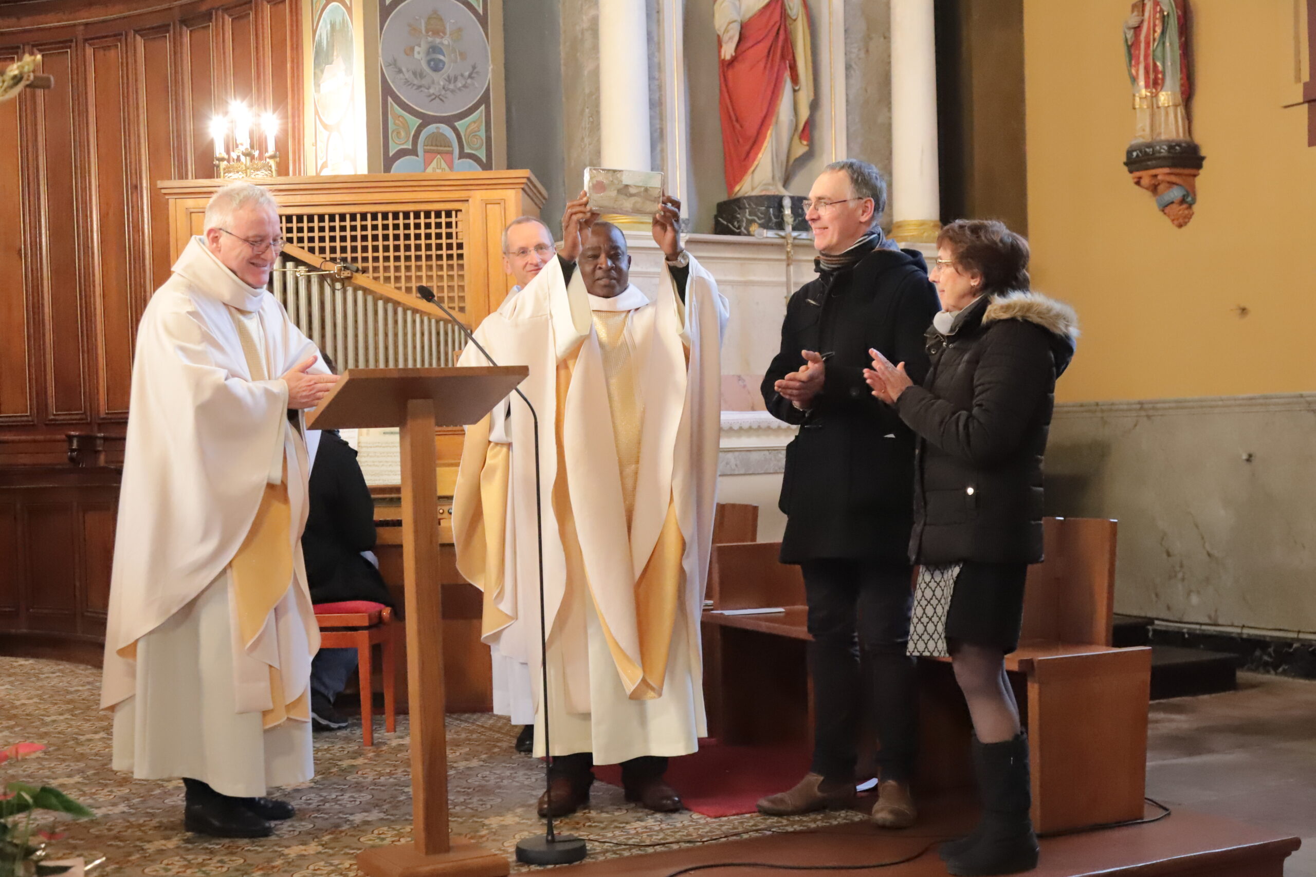 La messe était présidée par le père Denis Beligné, administrateur diocésain, et concélébrée par le père Luc Fritz, curé de la paroisse, et le père Pierre Abalangaz, curé de la paroisse Sainte-Lucie dans le diocèse de Belfort-Montbéliard.