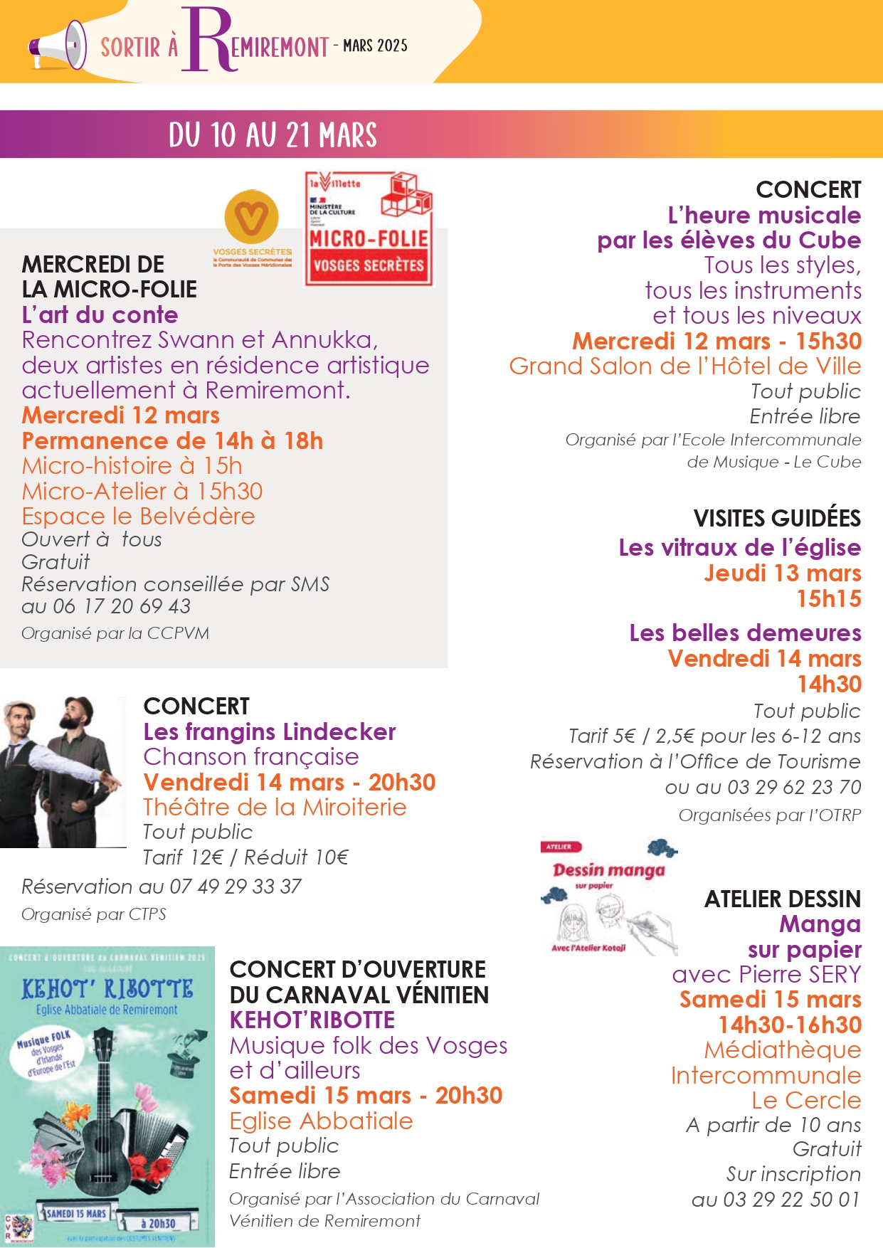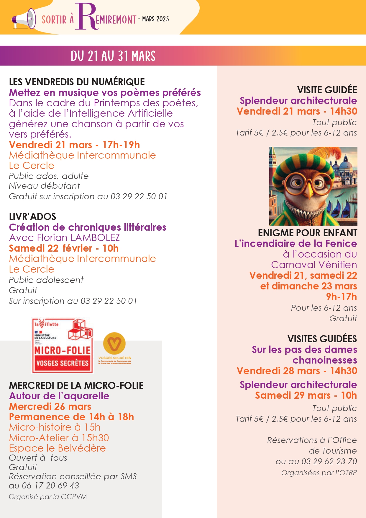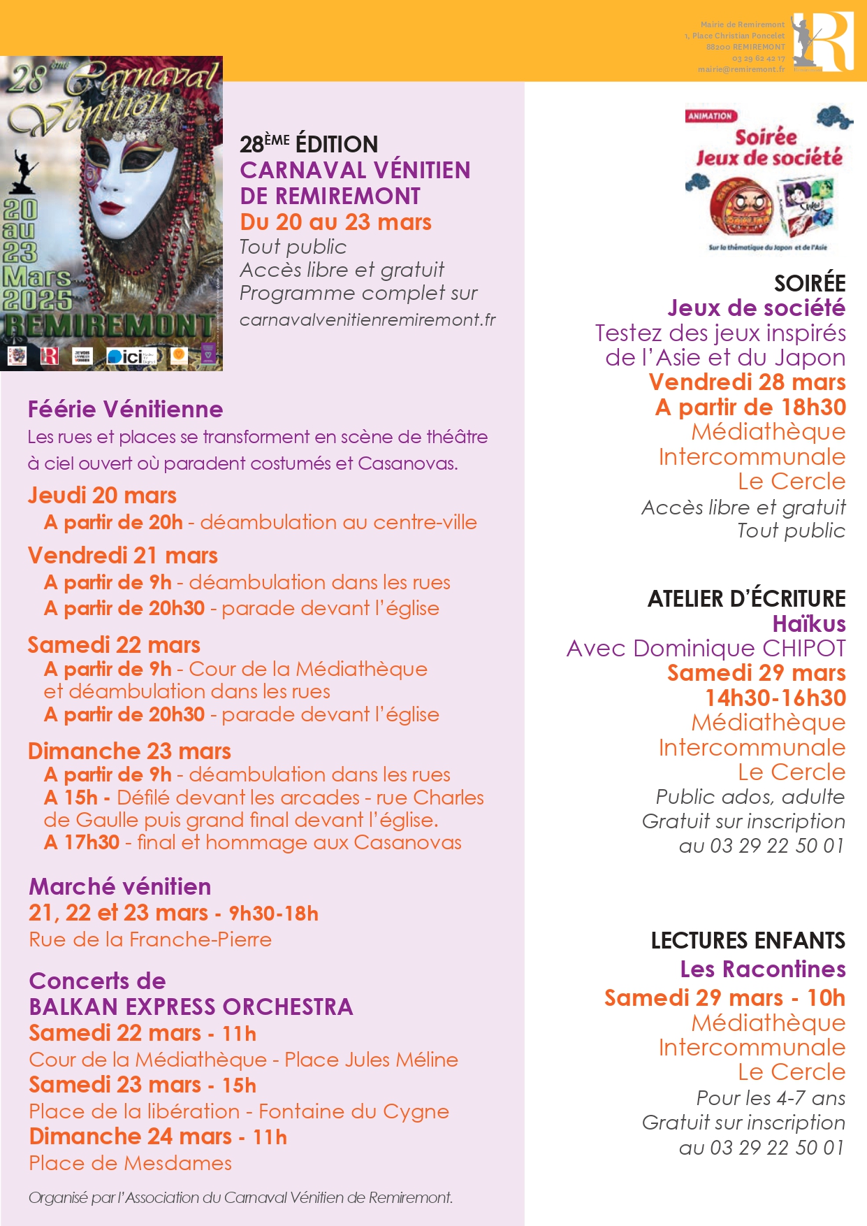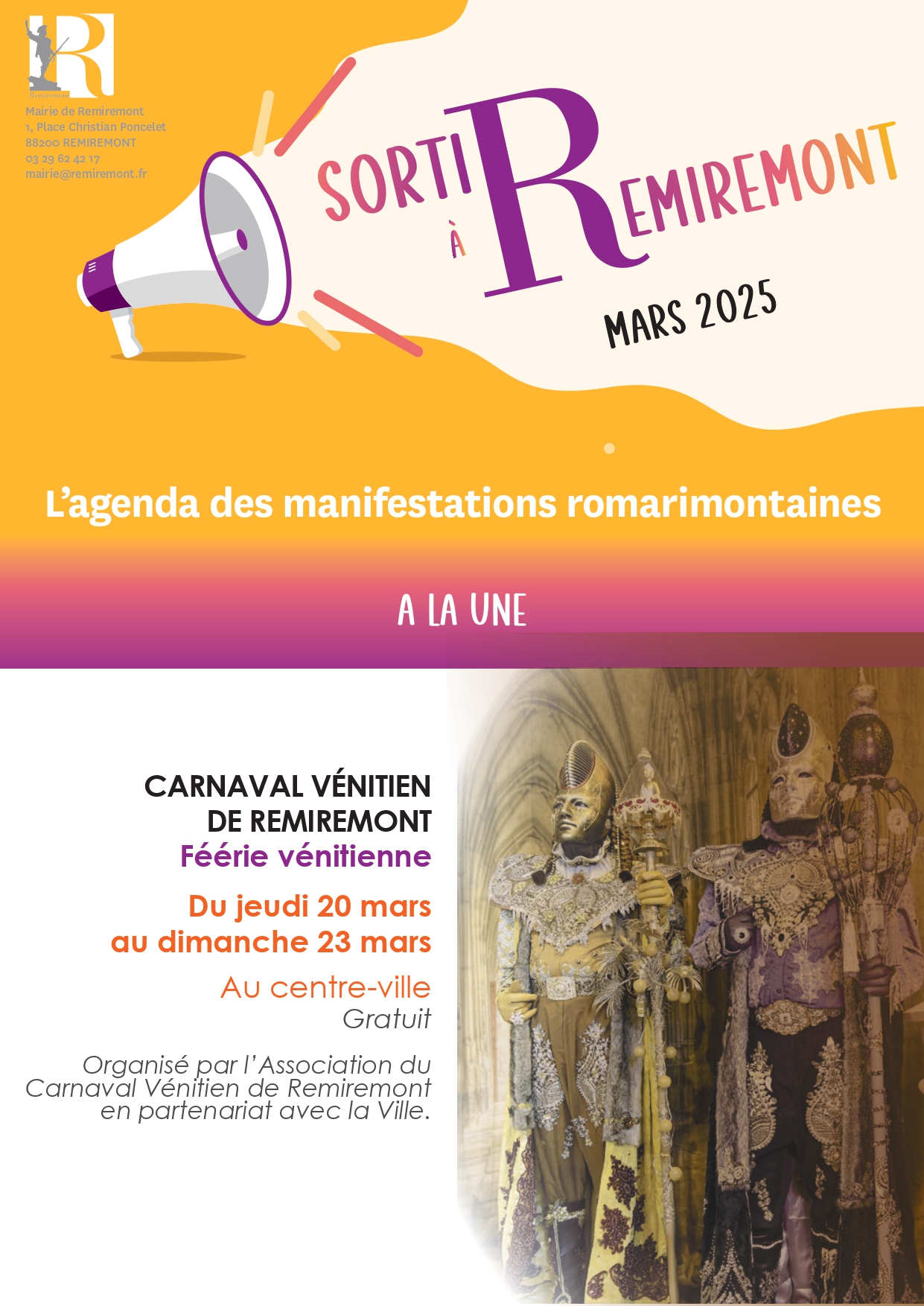 Retrouvez le programme des différentes animations de la ville de Remiremont pour le mois de mars 2025. L’évènement phare du mois est le traditionnel Carnaval Vénitien qui débutera le jeudi 20 mars et ce, jusqu’au dimanche 23 mars. La Micro-folie propose diverses animations variées encore tout ce mois de mars. De nombreuses conférences, visites guidées et expositions sont à retrouver !