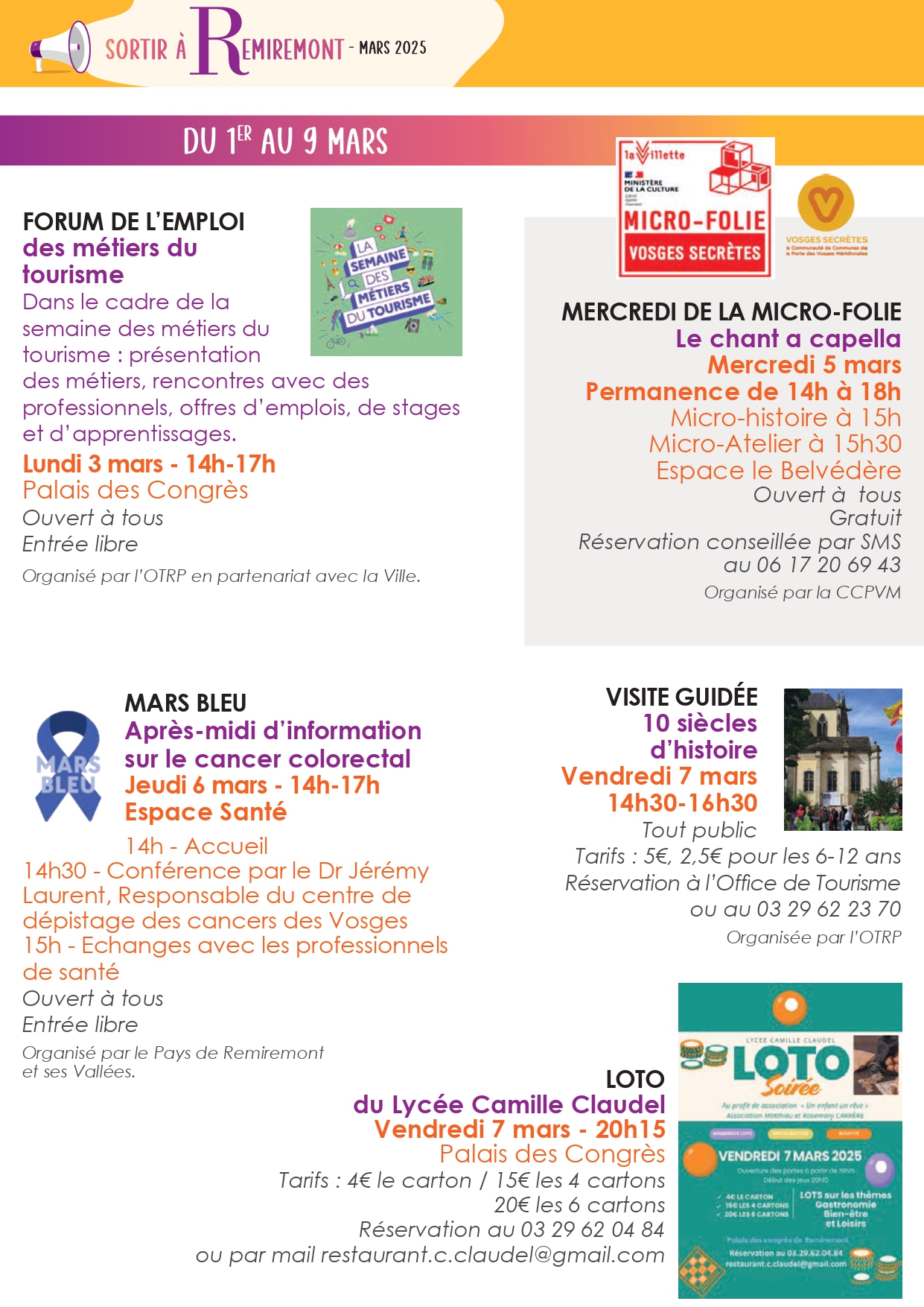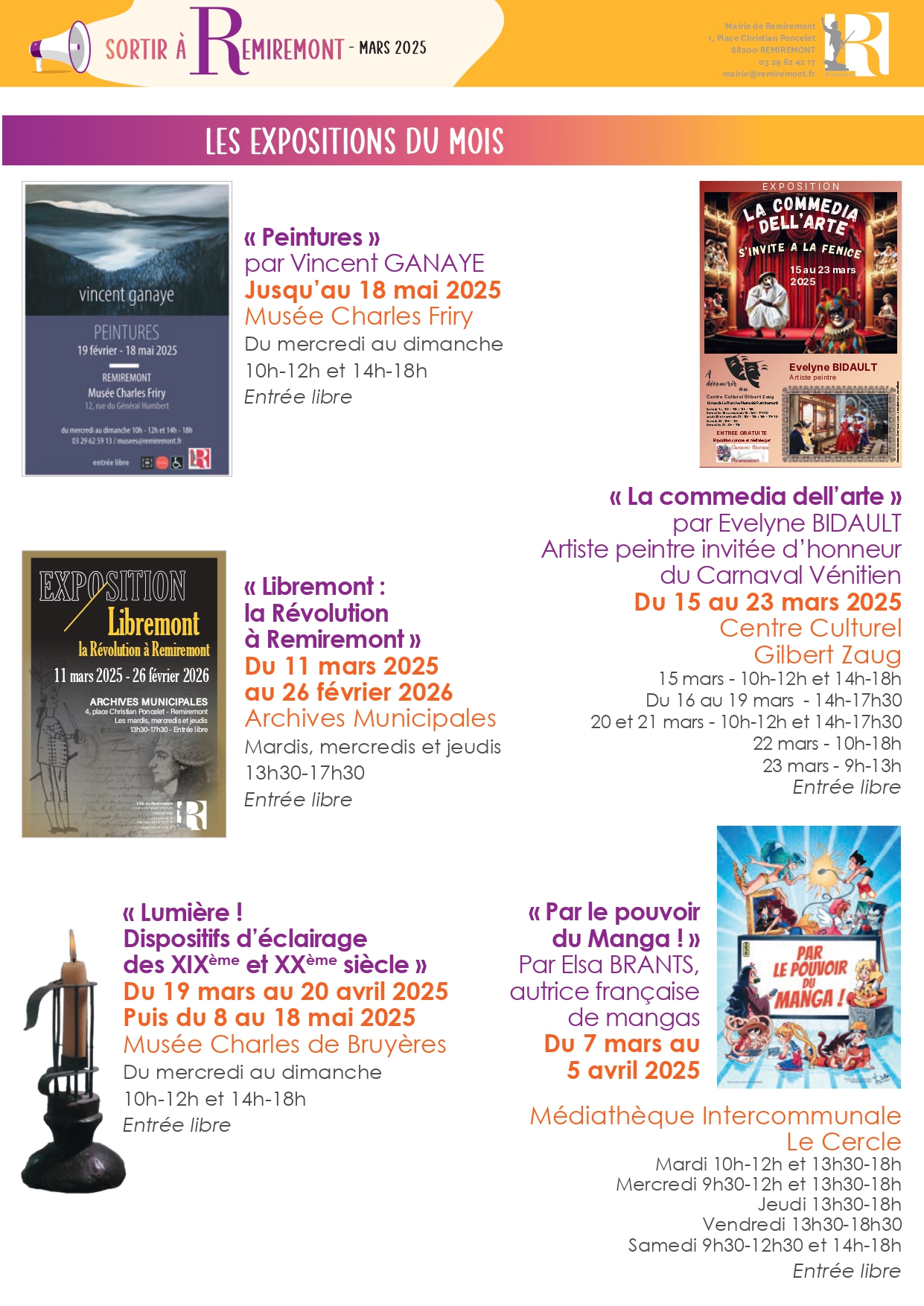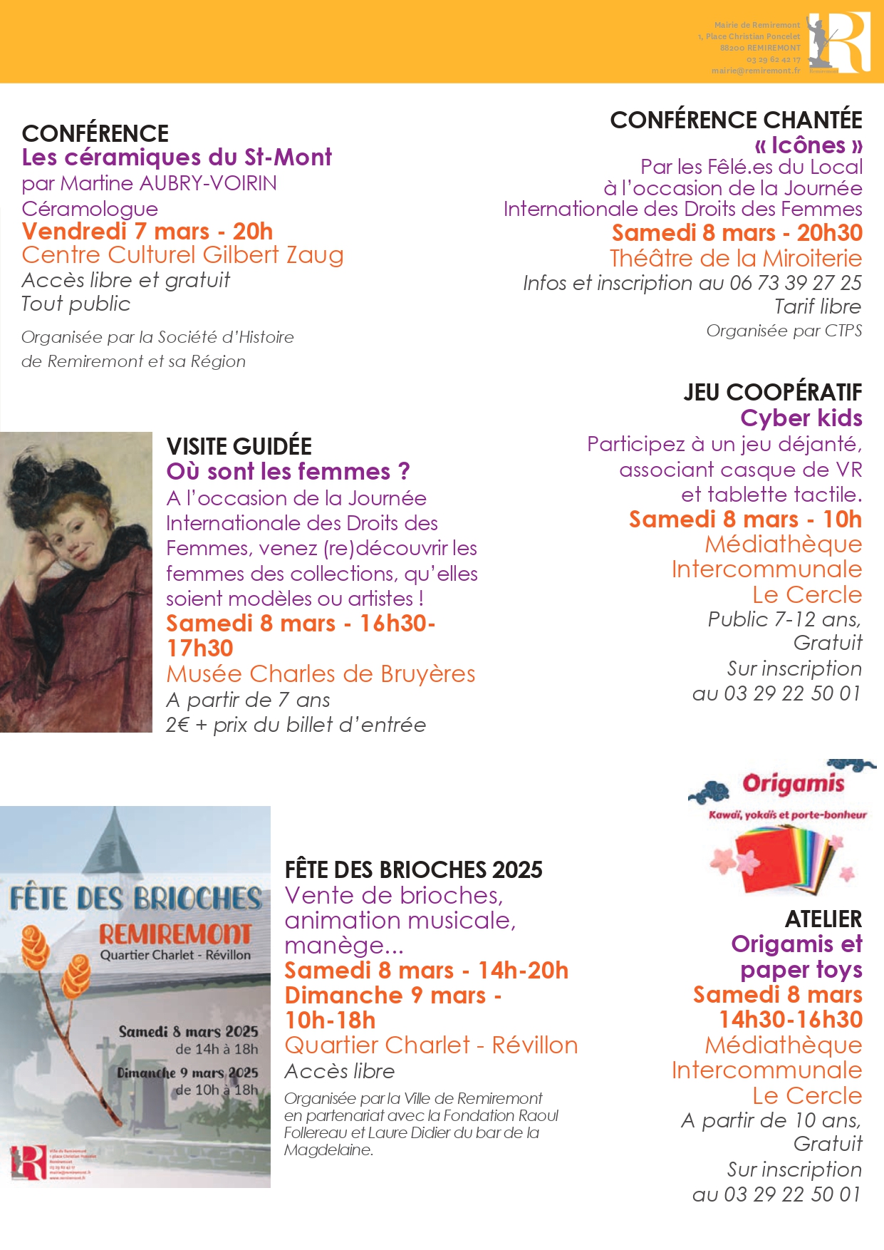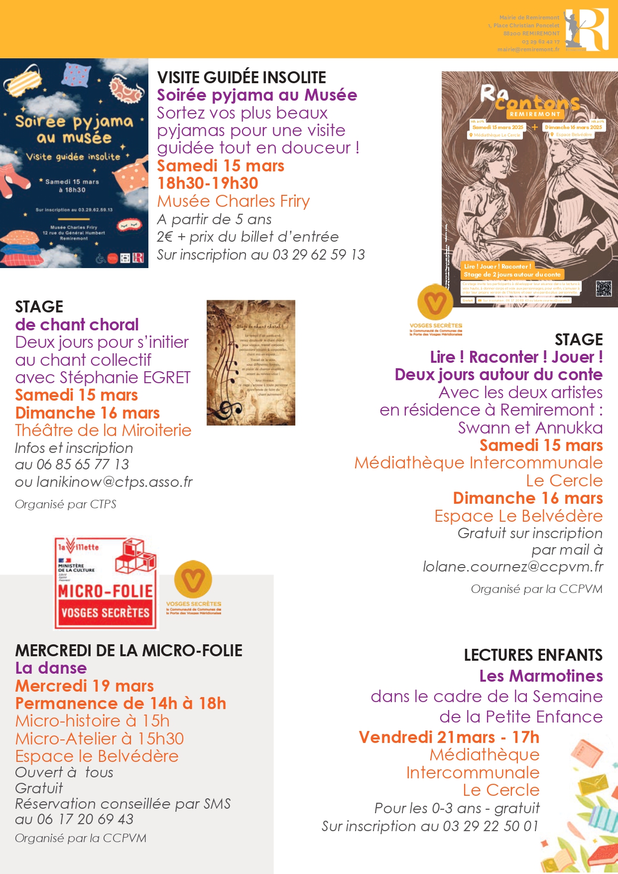 Retrouvez le programme des différentes animations de la ville de Remiremont pour le mois de mars 2025. L’évènement phare du mois est le traditionnel Carnaval Vénitien qui débutera le jeudi 20 mars et ce, jusqu’au dimanche 23 mars. La Micro-folie propose diverses animations variées encore tout ce mois de mars. De nombreuses conférences, visites guidées et expositions sont à retrouver !