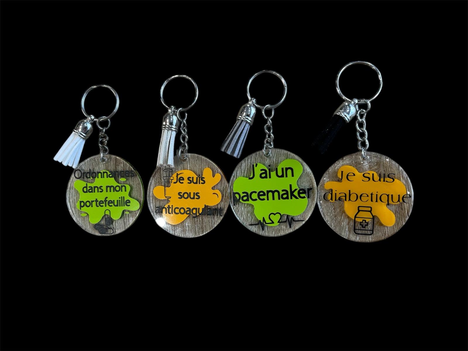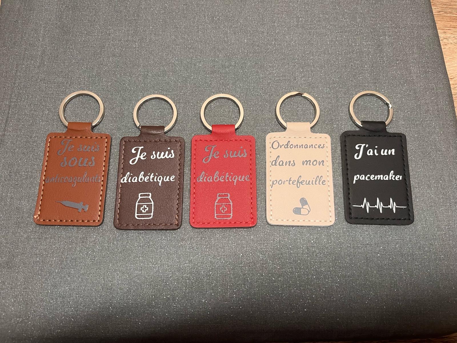 Ces créations sont réalisées sur disque en polyacrylique avec résine, ou en cuir synthétique avec un procédé thermocollant. Pourquoi le porte-clés ? Parce que c’est un objet que l’on a toujours sur soi, ce qui en fait un support idéal pour des informations vitales.