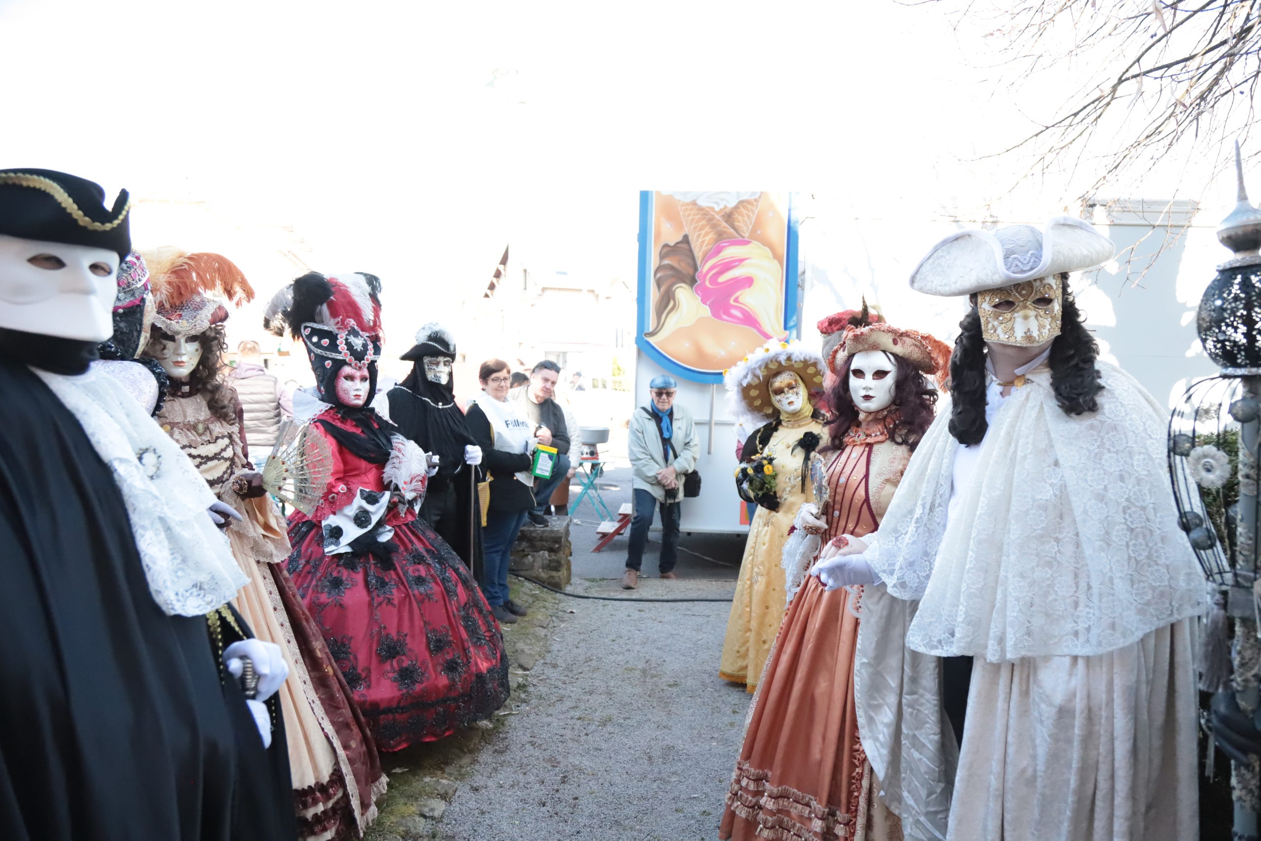 Les participants à l’office ont été accueillis à la sortie de la chapelle par une haie de costumés du carnaval vénitien. À ce moment-là, les musiciens de la batterie-fanfare de l’étendard ont débuté leur concert, donnant un autre rythme à la fête.