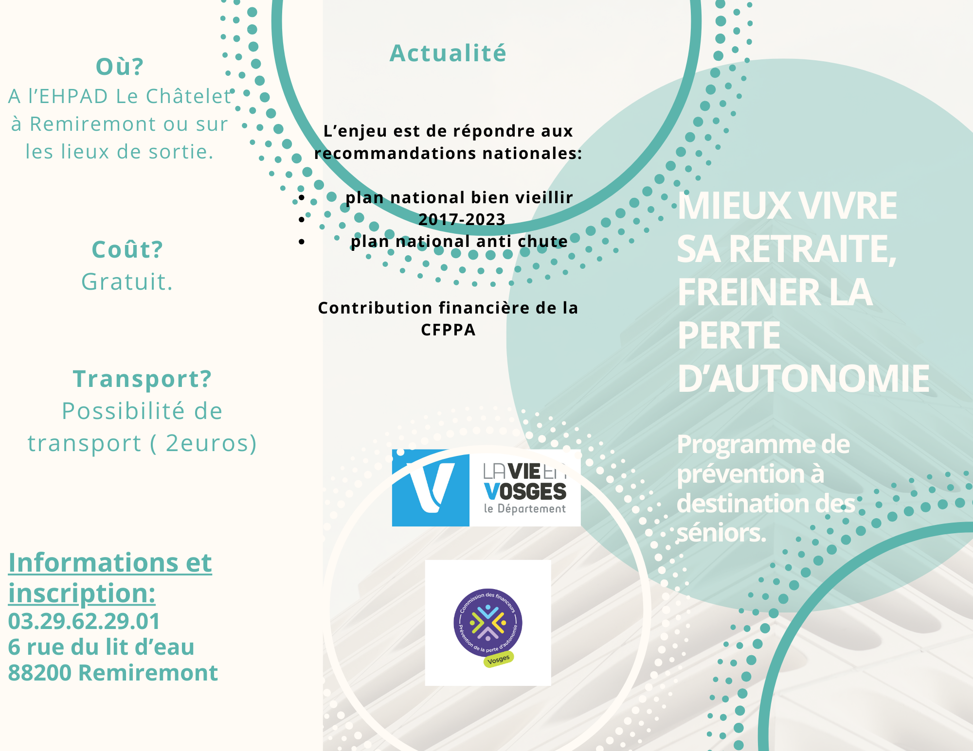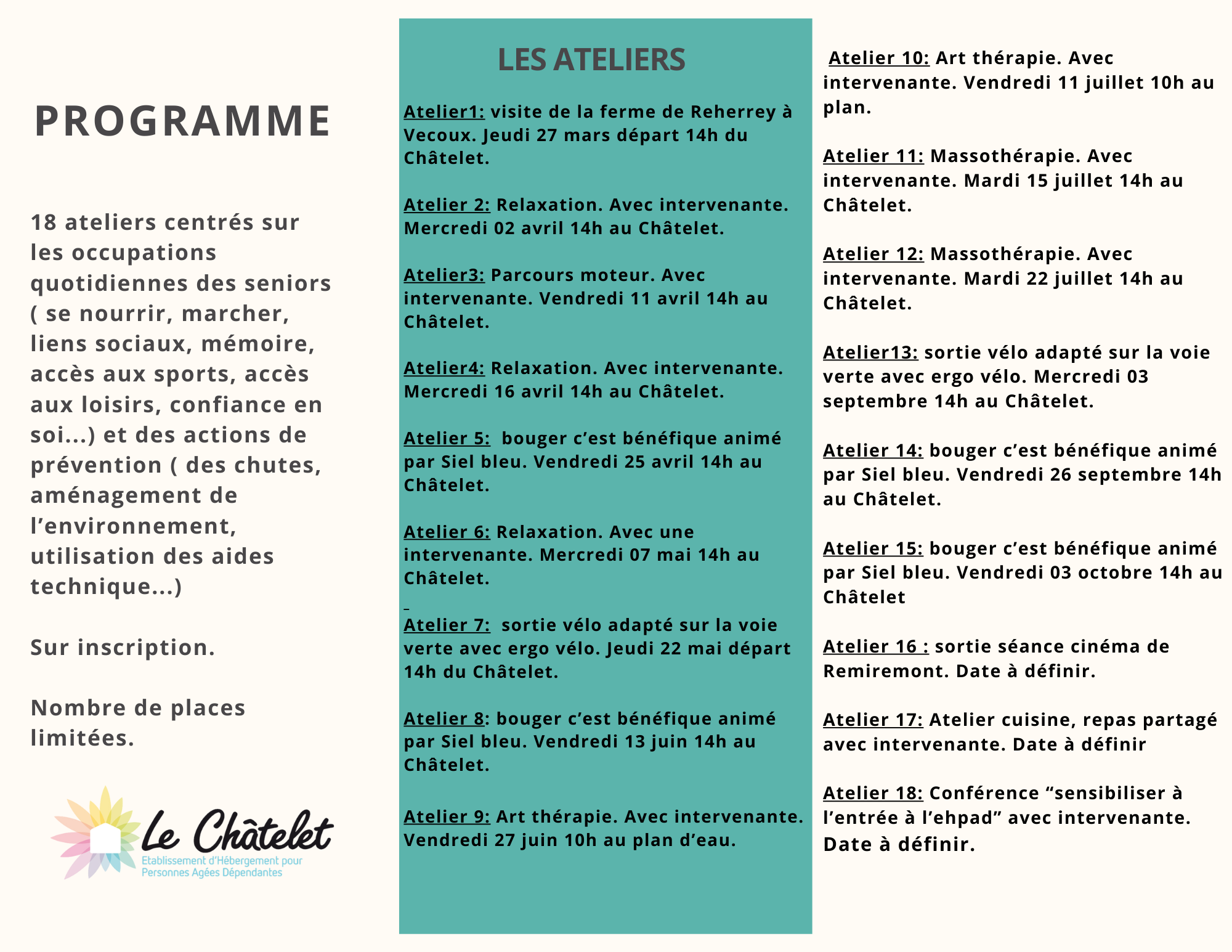 Nous invitons les seniors de Remiremont et ses alentours vivant à domicile à rejoindre nos ateliers. Pour plus d’informations et pour vous inscrire, n’hésitez pas à nous contacter au 03/29/62/29/01 ou par mail : animation@ehpad-lechatelet.fr
