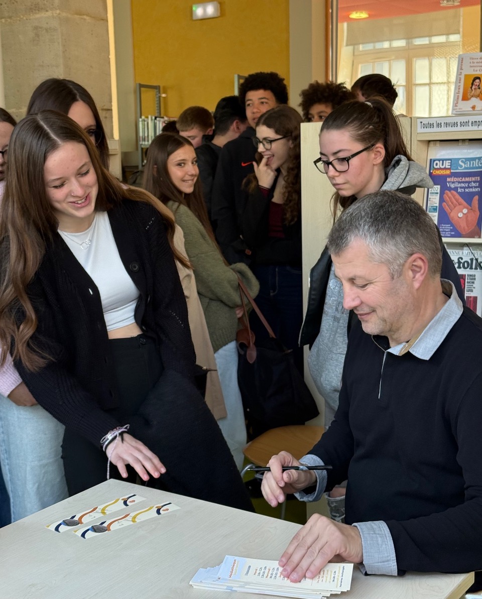 En tournée auprès des établissements scolaires dans le cadre de l’action « Auteurs en lycée » (financements Association Interbibly et pass culture), c’est à la médiathèque de la cité des Chanoinesse que le célèbre écrivain a répondu aux questions des élèves. Pour encadrer la classe étaient présentes la représentante d’Interbibly, Mme Louise Perrin, les organisatrices de l’action, les documentalistes Mmes Jacquel, Holderith et Mme Gauche, professeur de français de la classe. Une visite de la médiathèque avait été programmée juste avant la rencontre préparée en amont au CDI.