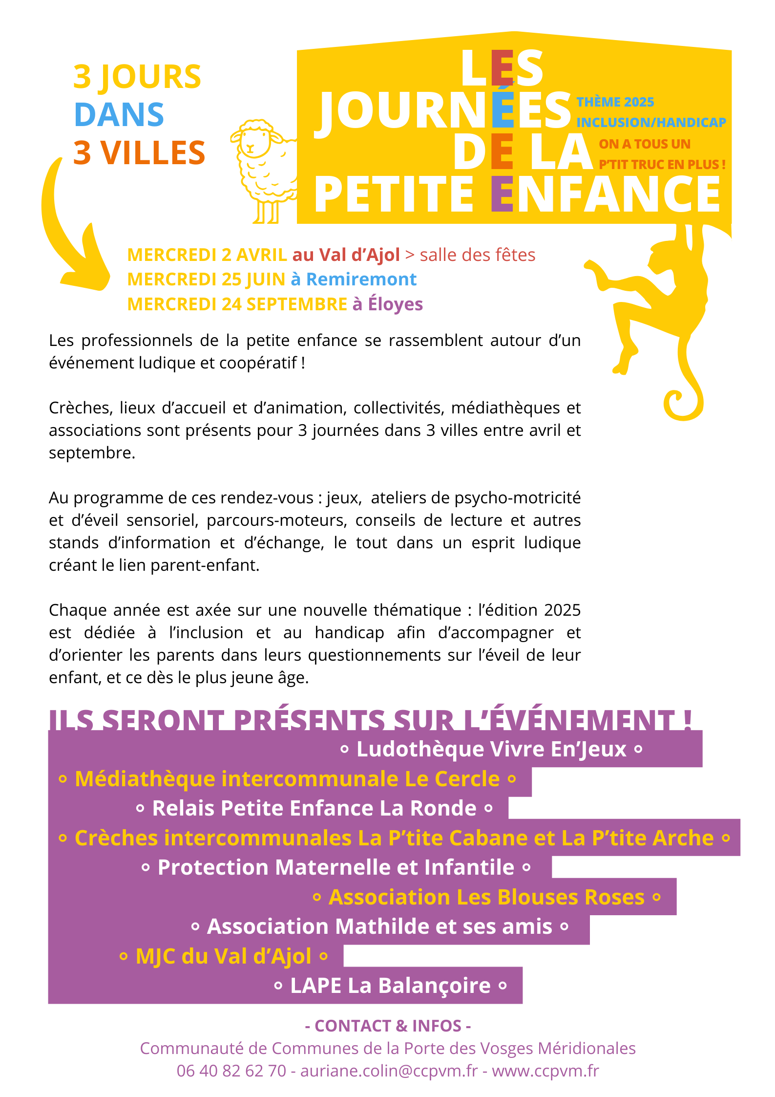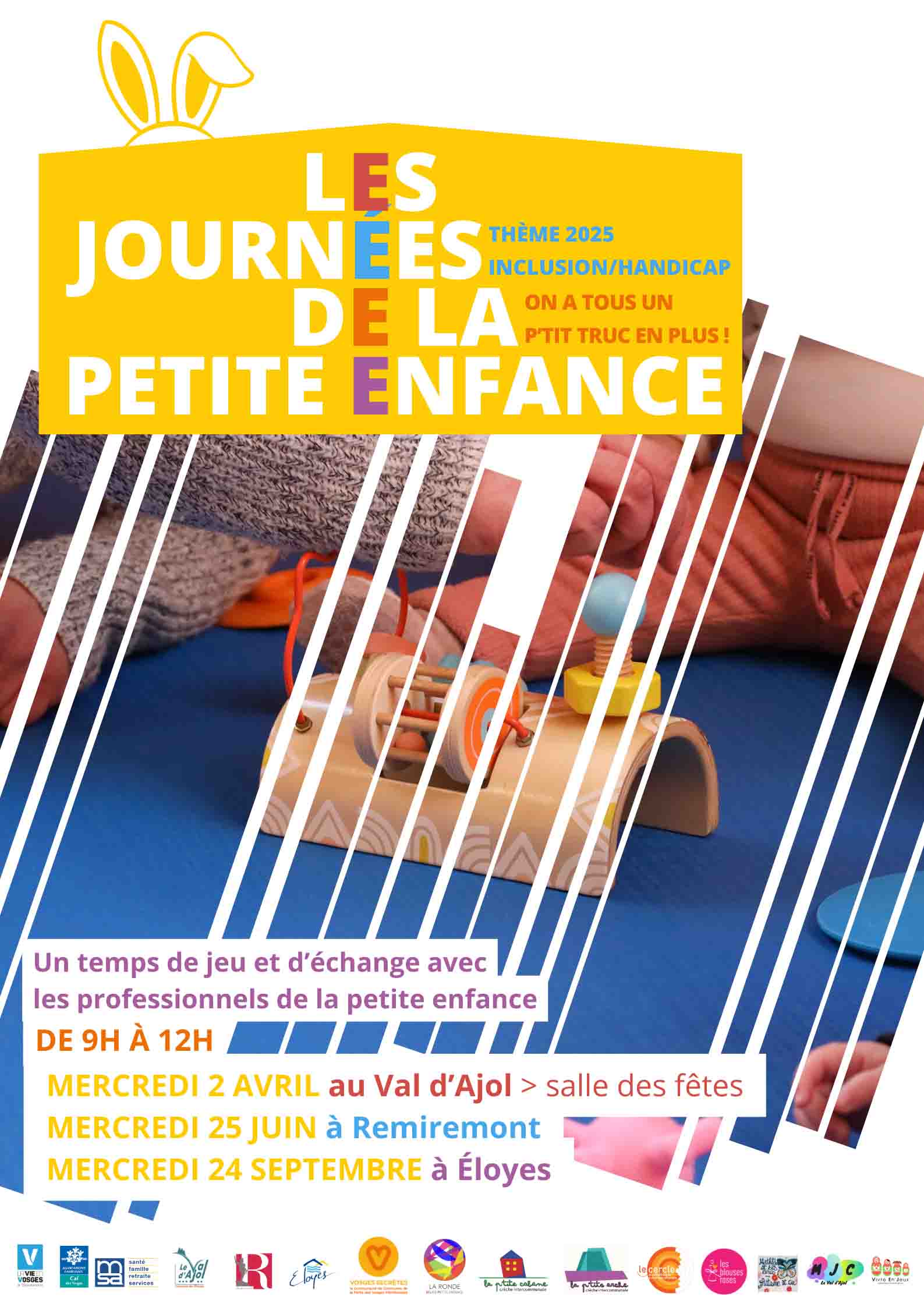 Crèches, lieux d’accueil et d’animation, collectivités, médiathèques et associations sont présents pour 3 journées dans 3 villes entre avril et septembre. Au programme de ces rendez-vous : jeux, ateliers de psycho-motricité et d’éveil sensoriel, parcours-moteurs, conseils de lecture et autres stands d’information et d’échange, le tout dans un esprit ludique créant le lien parent-enfant. Chaque année est axée sur une nouvelle thématique : l’édition 2025 est dédiée à l’inclusion et au handicap afin d’accompagner et d’orienter les parents dans leurs questionnements sur l’éveil de leur enfant, et ce dès le plus jeune âge.