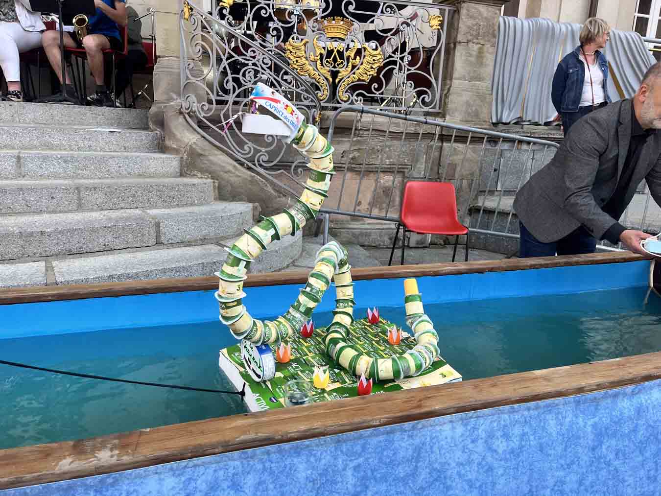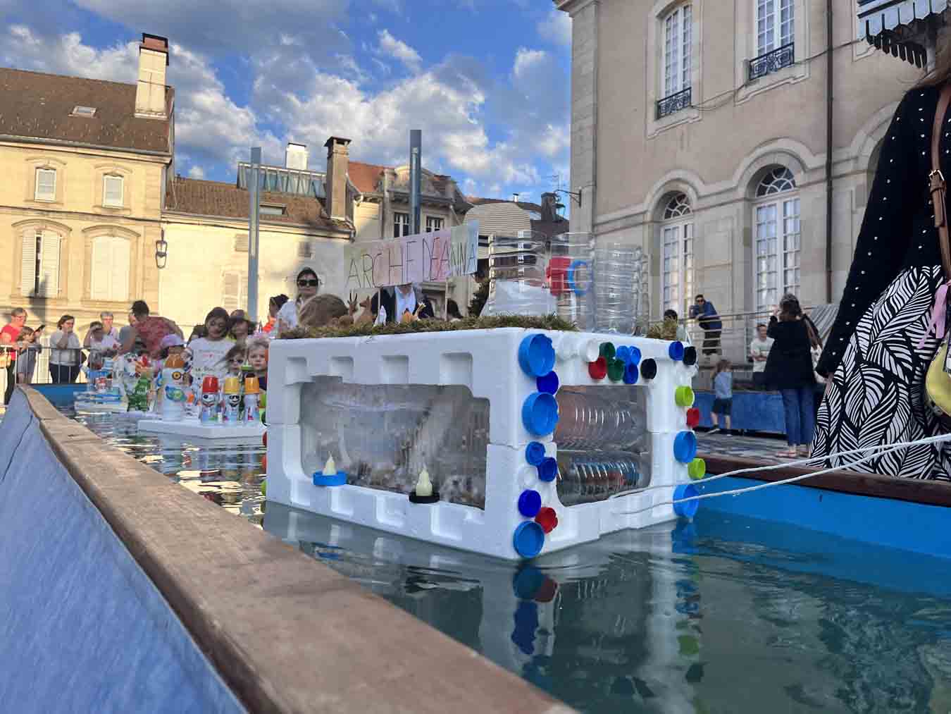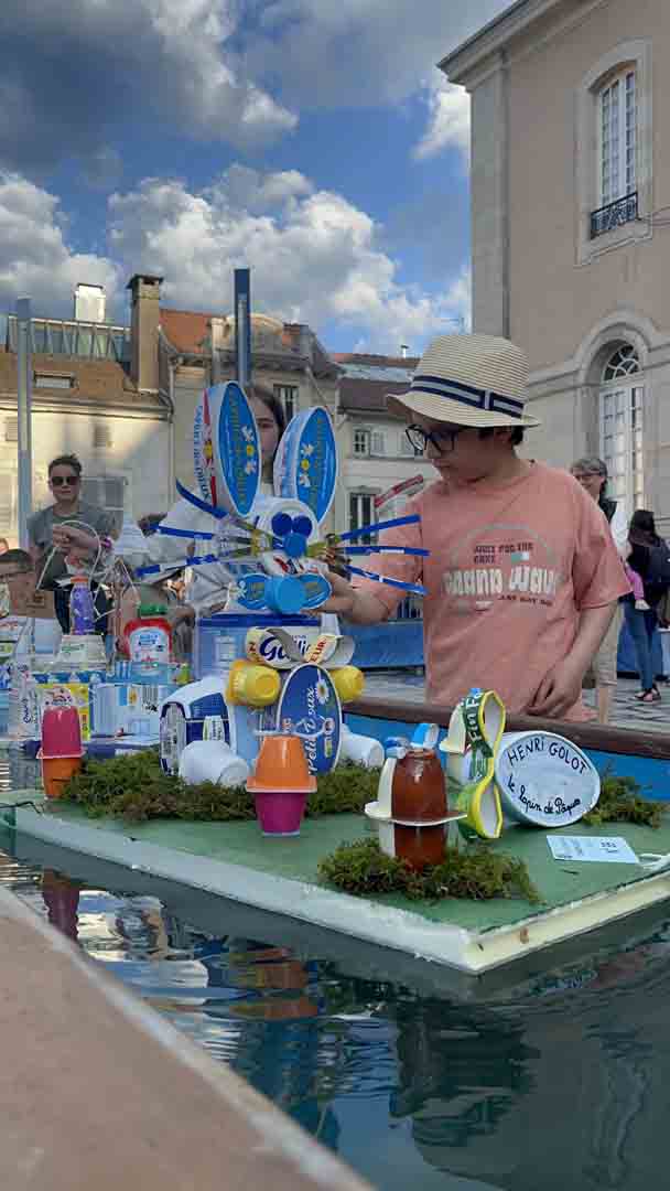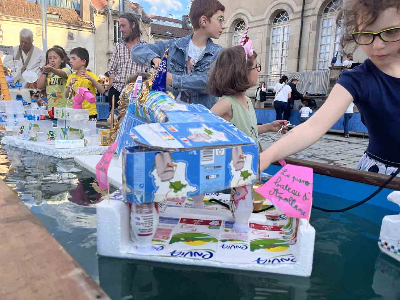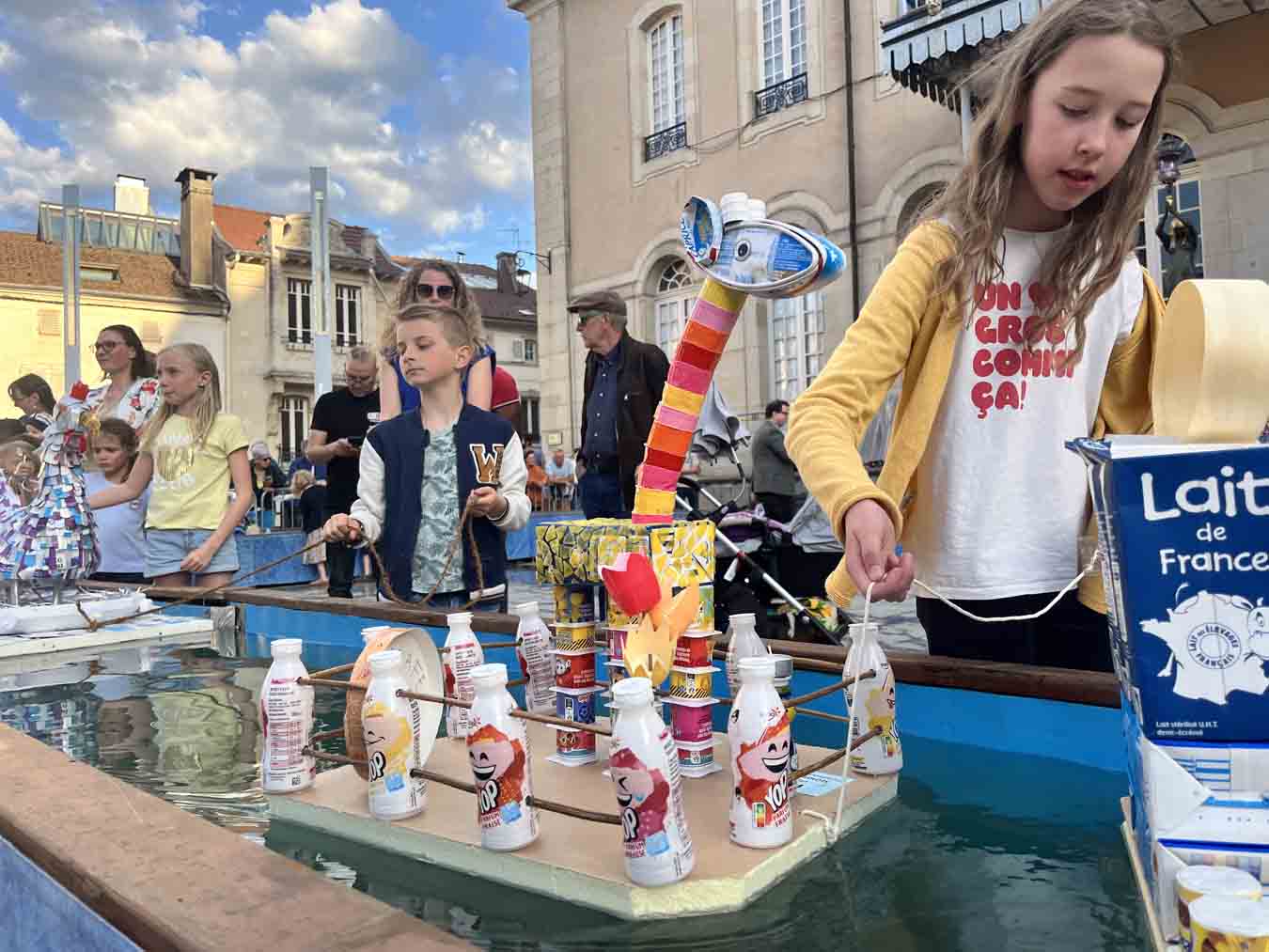 Les bateaux, fabriqués à partir de matériaux de récupération – principalement des emballages de produits laitiers –, ont rivalisé d’originalité et d’imagination. Parmi les créations les plus remarquées : un vélo, un coq, un serpent, et même une reproduction du Charles de Gaulle malicieusement rebaptisée « Charles de Gauche ».
