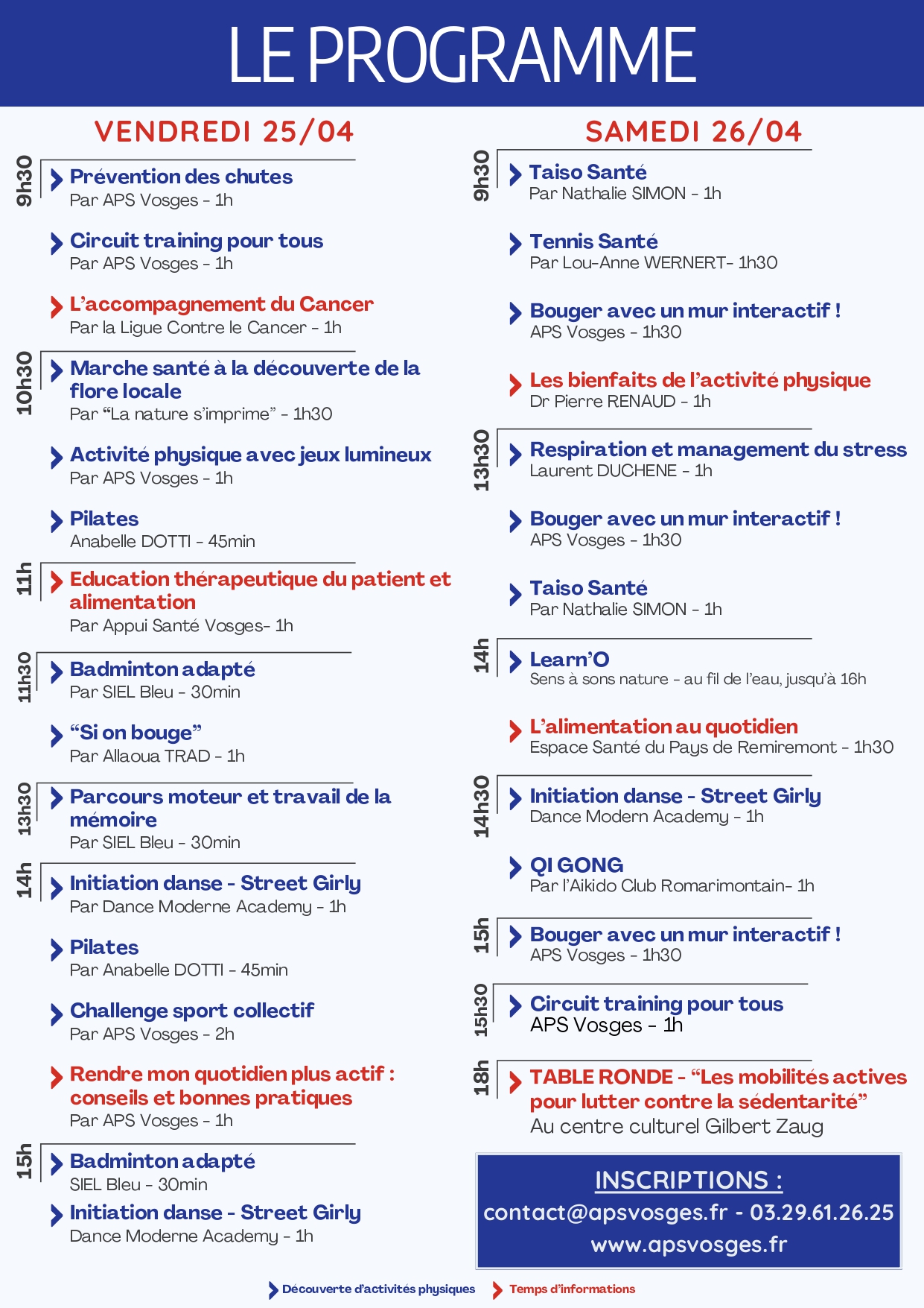 Les inscriptions aux animations se font sur le site internet de l’APS Vosges, par mail à contact@apsvosges.fr ou par téléphone au 03 29 61 26 25.