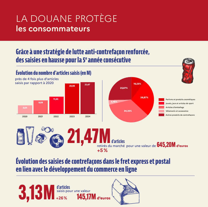 La douane française invite les consommateurs à être particulièrement vigilants compte tenu de la multiplication des contrefaçons de parfums saisies sur le territoire national ces derniers mois. 2 189 290 parfums ont été saisis en 2024, plus du triple de l’année précédente, 20 fois plus qu’en 2020.
