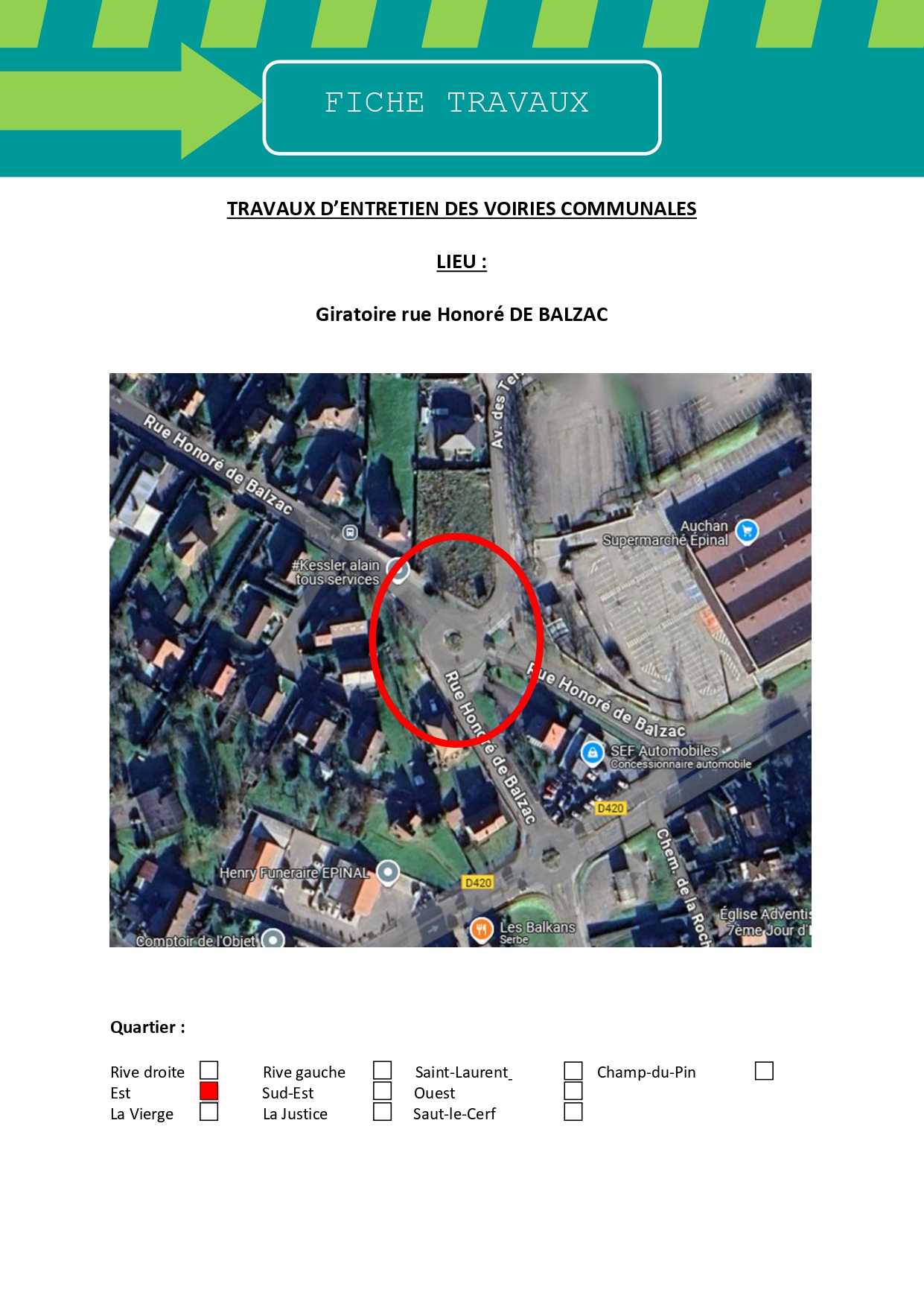 Ce même lundi 2 juin débutent les travaux de rabotage de la chaussée sur le giratoire de la rue Honoré–de–Balzac, menant à l’accès arrière du Centre des Congrès d’Epinal, dans le quartier Est de la Ville, avant la mise en place d’une nouvelle couche d’enrobé, le lendemain. Une déviation sera mise en place par l’allée des Noisetiers, pour les deux jours de travaux.