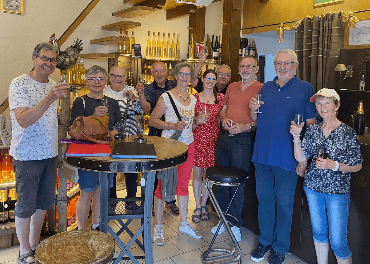 Les participants ont ensuite visité les installations de production du fameux vin de rhubarbe de la Maison Moine. Les explications ont été données par Yannick Moine, co-dirigeant avec son frère Damien de la Maison Moine fondée par Michel Moine et son épouse Éliane il y a plus de 40 ans. Puis, en fin de matinée, tous se sont retrouvés dans la boutique pour déguster les spécialités de la maison : « Blanc des Vosges » en bouteille bleue, « Perle de Crillon » selon la méthode champenoise et le fameux « Crillon des Vosges » servi dans de nombreux restaurants étoilés dans le monde entier. Ils ont également découvert les nouveautés : « Rosé de rhubarbe » et le « Vinaigre de rhubarbe ».