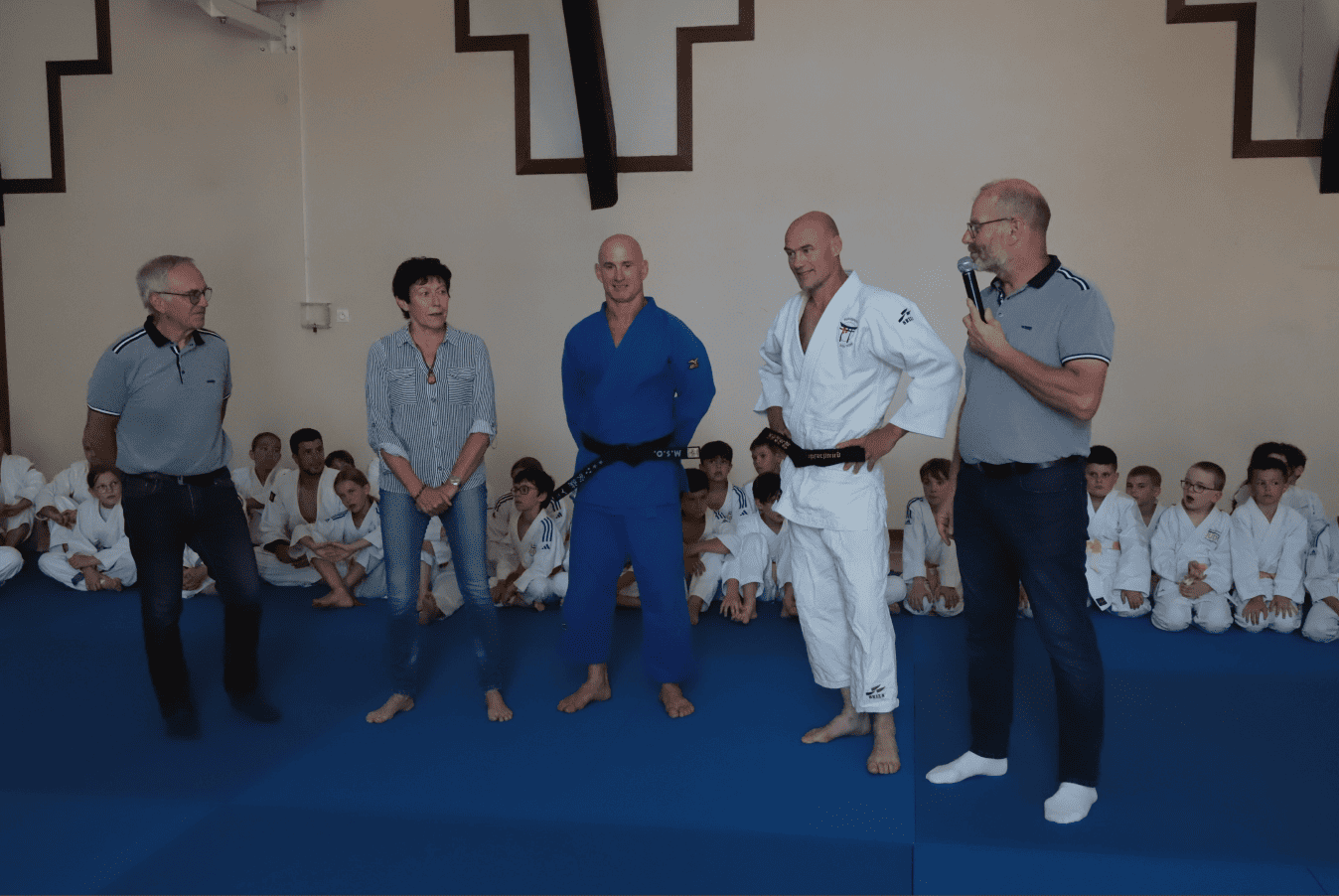 Muriel Mougin, la présidente de Raon aux Bois Judo, entourée des deux entraineurs Yann Robischung et Mikaël Bussière (tous les deux, ceinture noire 5ᵉ dan), du maire de Raon-aux-Bois Christian Vitu, mais aussi de Jean-François Clasquin, maire de Hadol (arborant tous les deux le même tee-shirt !), était très heureuse d’ouvrir cette cérémonie.