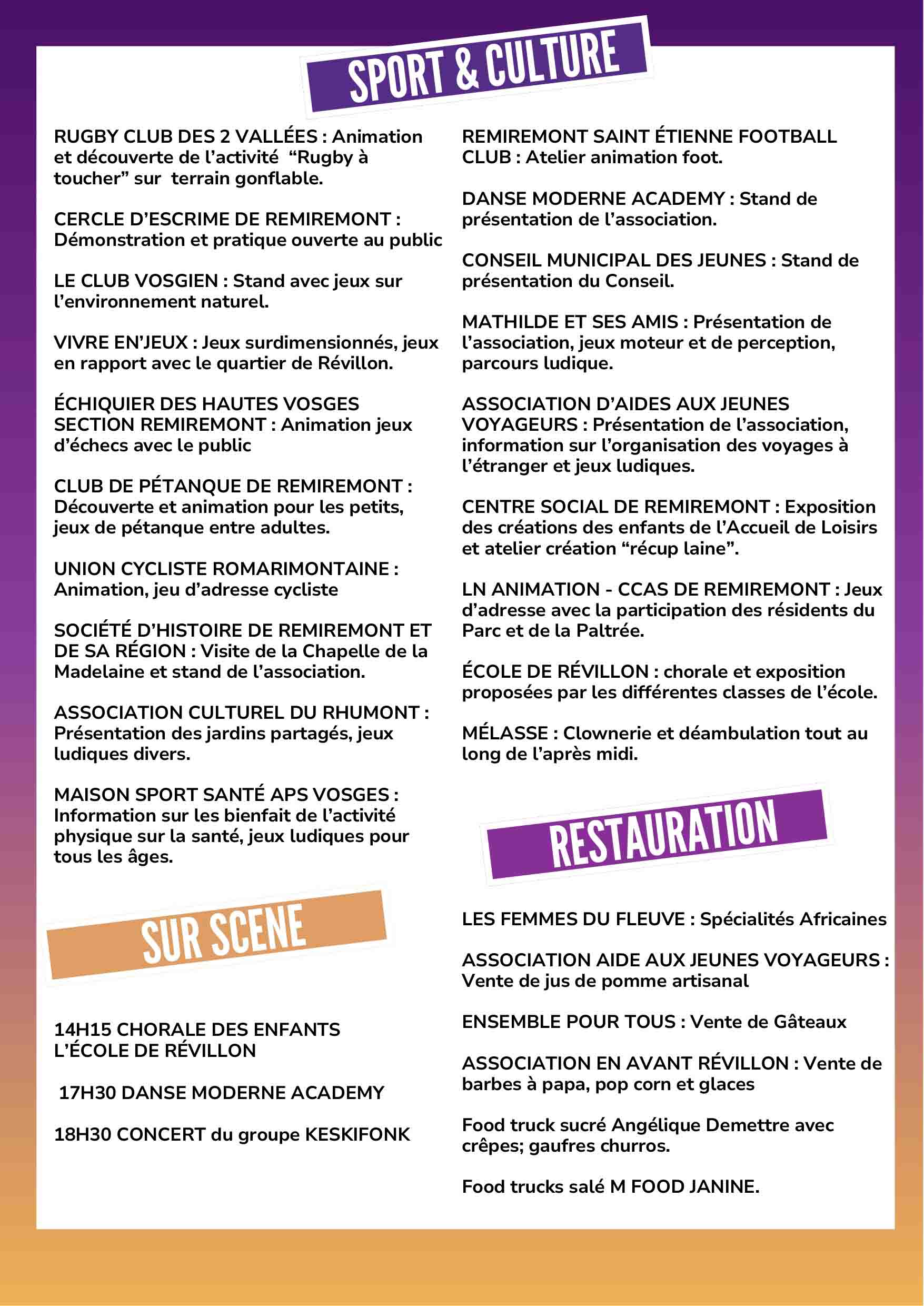 Ancien quartier ouvrier, Révillon est pleinement intégré à la vie romarimontaine. L’évènement vise à valoriser ses habitants, ses infrastructures — dont son école, la plus récente de la commune — et à rappeler l’histoire riche du quartier. À cette occasion, le Centre social de Remiremont, en partenariat avec la Ville et de nombreuses associations locales, propose un programme culturel, ludique et sportif entièrement gratuit, à destination de toutes les générations.