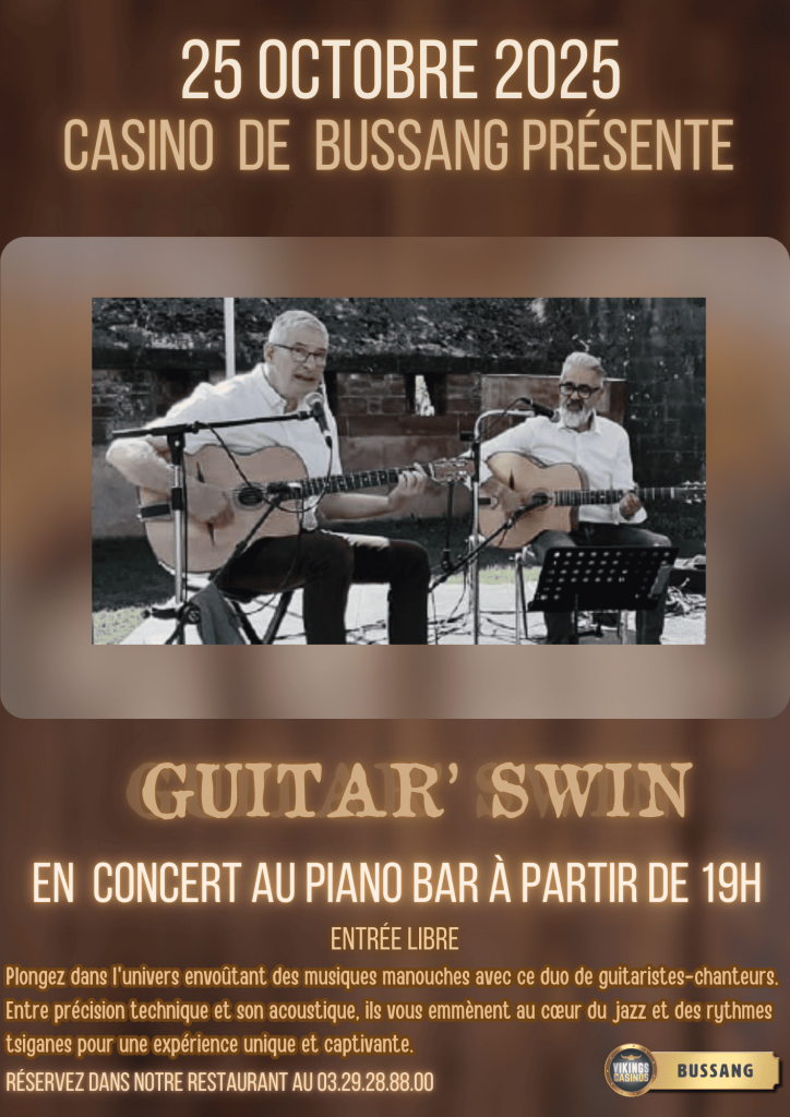 La prochaine animation musicale gratuite dans le piano-bar du casino de Bussang aura lieu ce vendredi 25 octobre dès 19h 00 avec un nouveau concert de « Guitar Swing ».