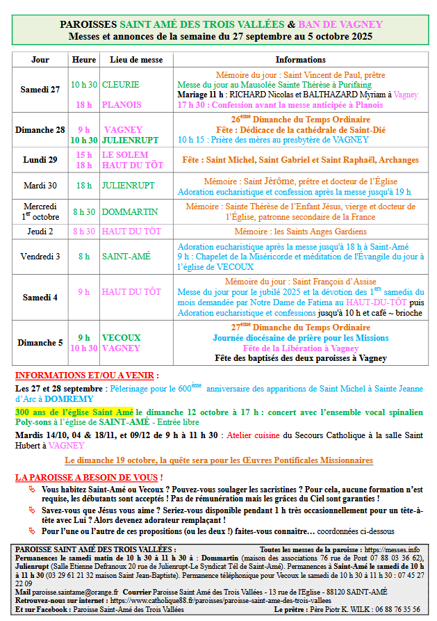 Messes et annonces de la semaine du 27 septembre au 5 octobre