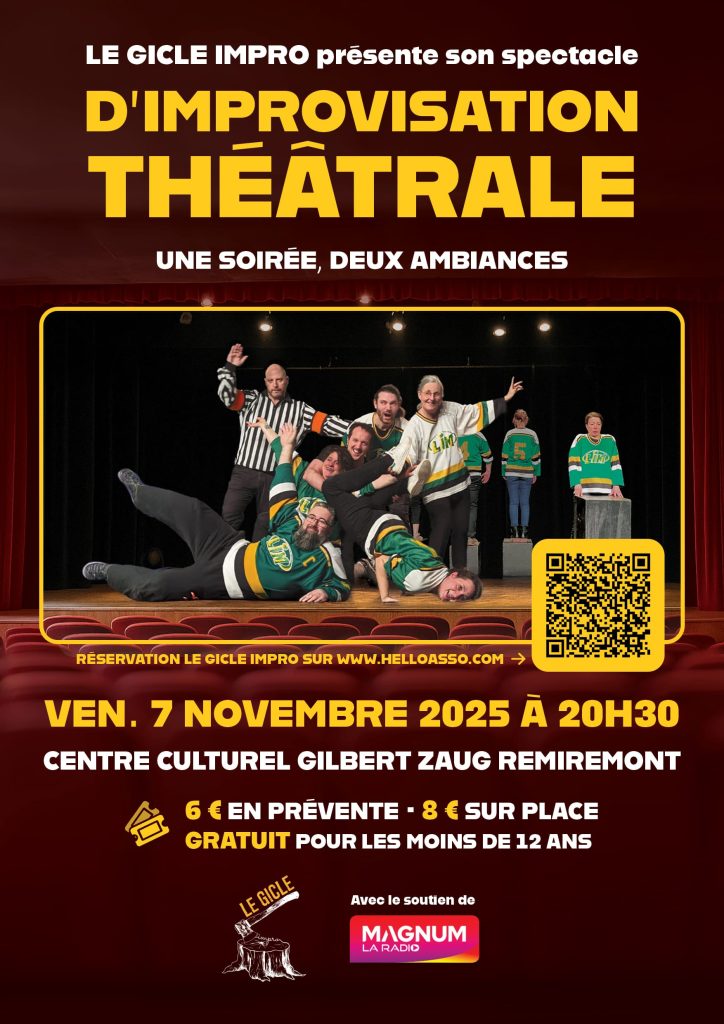 La troupe d’improvisation théâtre le Gicle Impro se produira le 7 novembre à 20h30 à l’espace Gilbert Zaug de Remiremont.