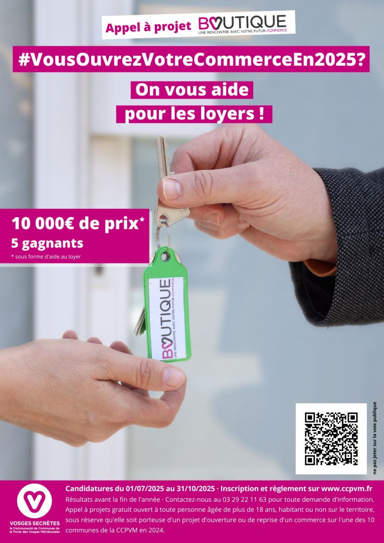 Vous avez plus de 18 ans ? Vous avez un projet d’ouverture ou de reprise d’un commerce sur le territoire de l’une des 10 communes de la Communauté de Communes de la Porte des Vosges Méridionales ? Votre projet nécessite la location d’un local commercial ? Vous avez encore 15 jours pour déposer votre candidature à l’appel à projets BOUTIQUE.