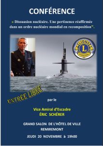 éclairée, une conférence sur « la permanence réaffirmée de la dissuasion dans un ordre nucléaire mondial en recomposition ». Celle-ci, aura lieu le jeudi 20 novembre à 19h00 dans le Grand salon de l’hôtel de ville de Remiremont où nous aurons l’honneur, voire le privilège, d’accueillir le Vice-amiral d’Escadre Éric Shérer, diplômé de génie atomique, lequel a alterné les affectations sur les sous-marins nucléaires d’attaque et lanceurs d’engins dont il a commandé « La Perle et le Vigilant ». En 20 ans aux sous-marins, l’amiral Schérer a totalisé 25 000 heures de plongée avant de poursuivre sa carrière à l’état-major de la Marine, l’état-major des Armées ponctuée d’une formation comme auditeur au « Nato Defence College » de Rome. Ses dernières affectations en responsabilité sont le commandement de la base de défense de Toulon, le poste d’inspecteur des armements nucléaires, sous les ordres directs du chef de l’état-major particulier du Président de la République, et celui d’inspecteur de la marine nationale. Le vice-amiral d’escadre Éric Schérer est marié et père de quatre enfants. Il est commandeur de la Légion d’honneur et commandeur de l’ordre national du Mérite. Il quitte le service actif le 30 septembre 2019, mais coordonne jusqu’en 2025, au profit du Secrétariat général de la Défense et de la Sécurité nationale, l’activité d’un groupe de travail d’histoire contemporaine sur la dissuasion et le nucléaire militaire. Il est membre titulaire de l’Académie de marine depuis 2022. Il a été fait citoyen d’honneur de la ville de Remiremont en 2024 ».