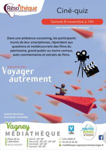 « Amateur de cinéma ? Envie de tester vos connaissances dans la bonne humeur ? Du grand classique au nanard, rendez-vous à la médiathèque à Vagney le 8 novembre à 14h pour tester vos connaissances ! Ouvert à tous (même pour les non-adhérents) et gratuit »