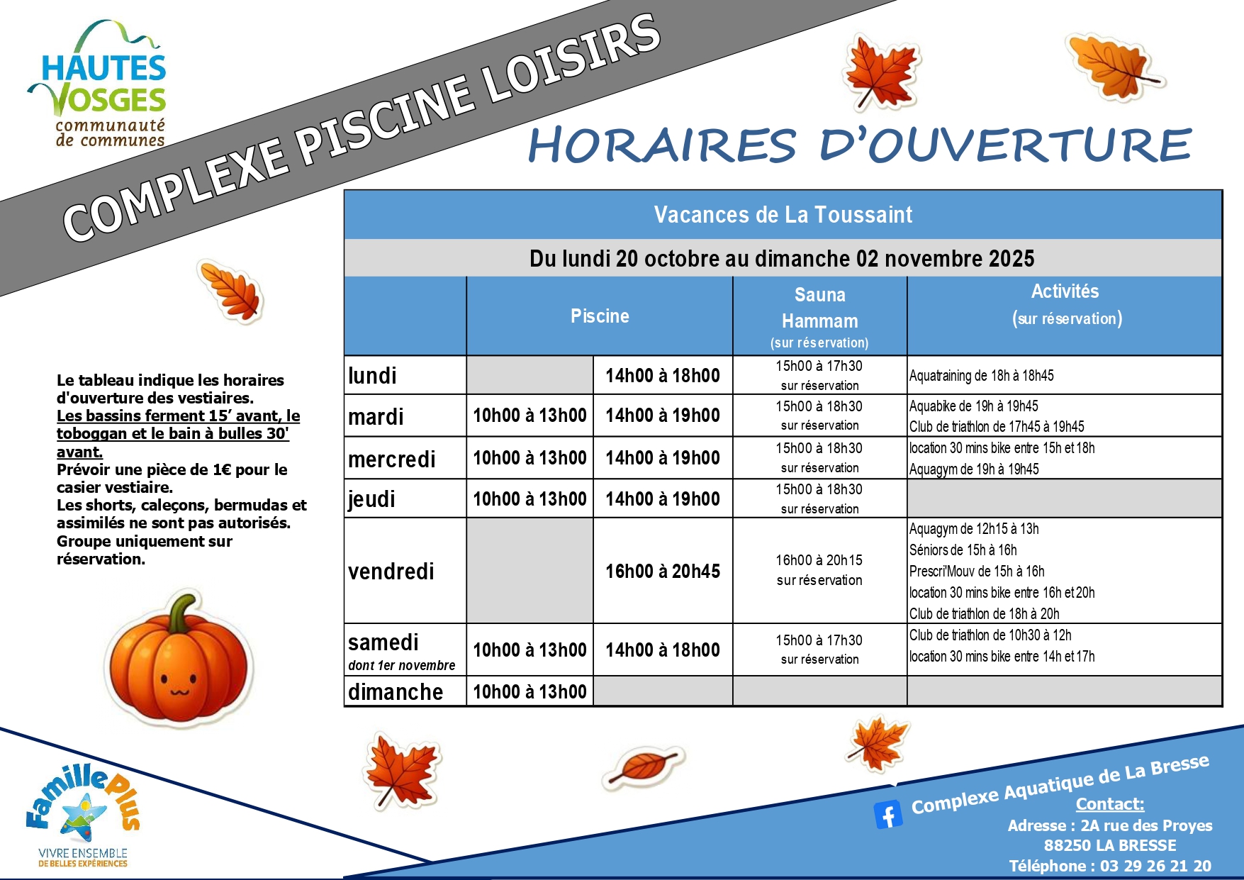 – samedi 1er novembre : piscine ouverte de 10h à 13h et 14h à 18h00