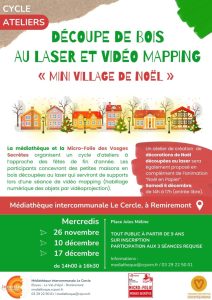 La médiathèque et la Micro-Folie des Vosges Secrètes organisent un cycle d’ateliers à l’approche des fêtes de fin d’année. Les participants concevront des petites maisons en bois découpées au laser qui serviront de supports lors d’une séance de vidéo mapping (habillage numérique des objets par vidéoprojection).