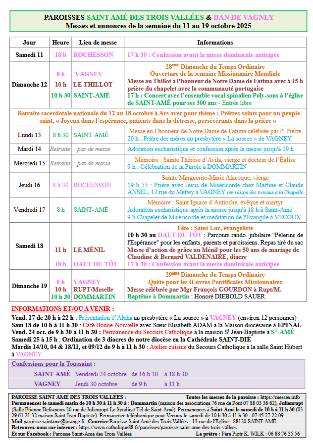 10 octobre 2025 | A la Une | Agenda | La Bresse & son canton | Le Thillot & son canton | Religion | Remiremont & son canton | Vie religieuse