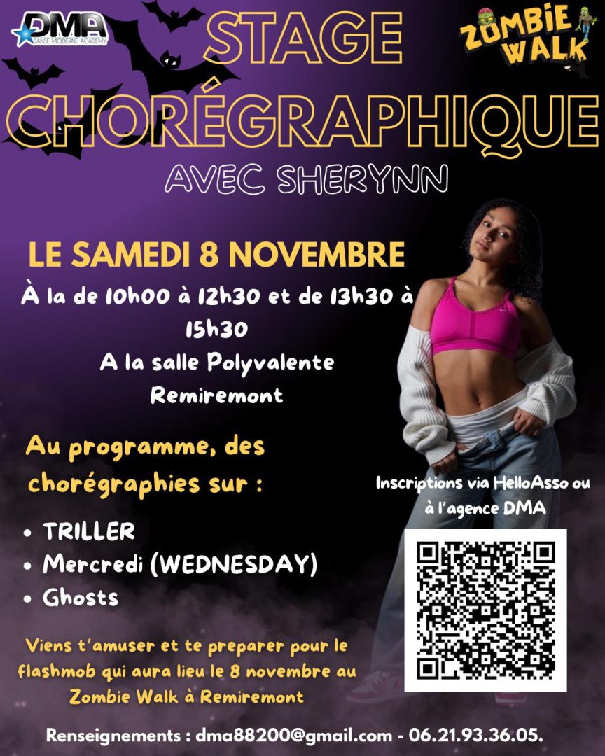 Tu veux faire partie du final spectaculaire de la Zombie Walk 2025 à Remiremont ? Rejoins le stage de danse moderne proposé par la Danse Moderne Academy (DMA) et prépare-toi à incarner un zombie dansant sur les titres cultes Thriller, Ghosts et Wednesday !